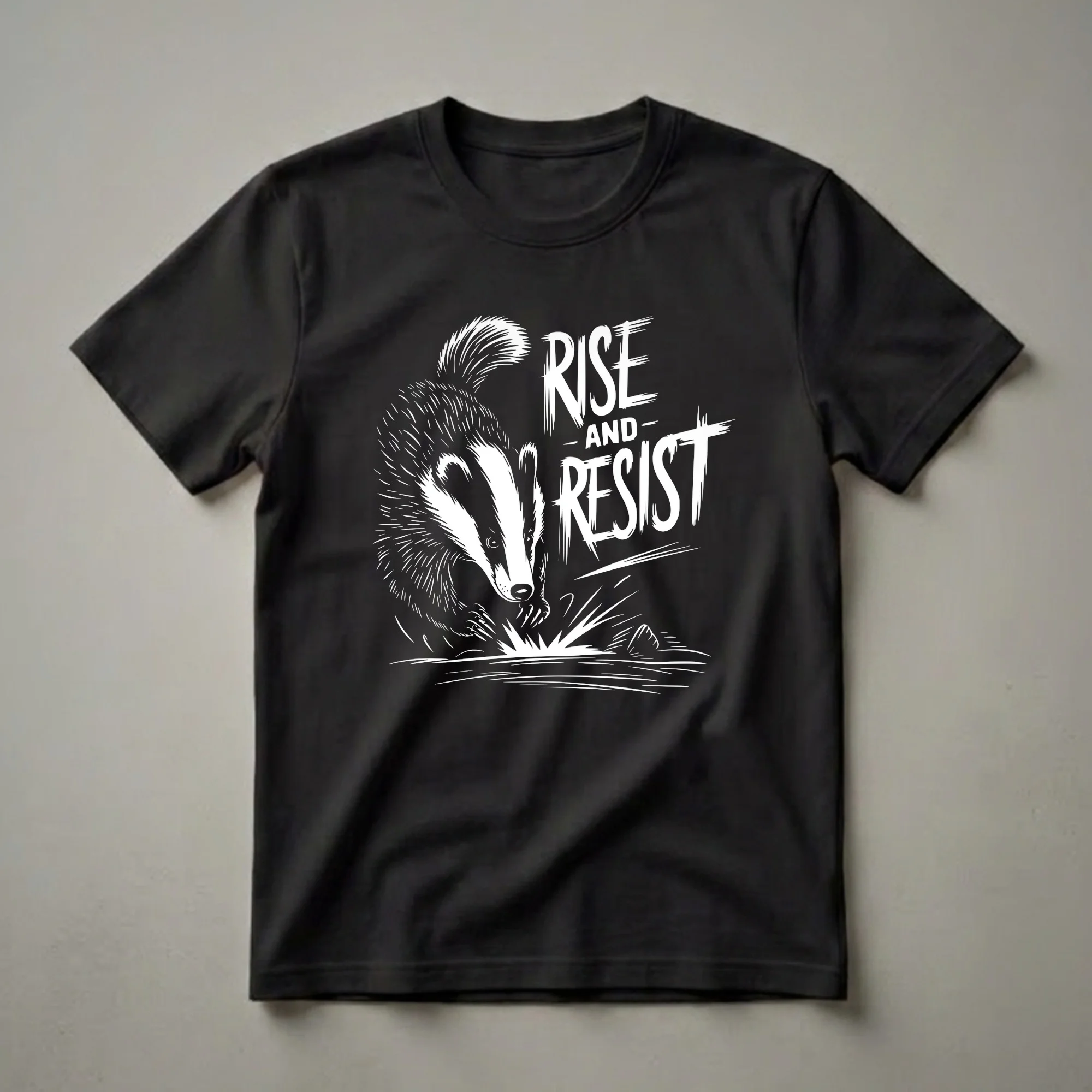 Wildlife enthusiasts and nature lovers will appreciate this striking graphic t-shirt featuring a determined badger. The design showcases a badger in mid-stride, claws extended, with the bold text 'Rise and Resist' emblazoned beside it. Badgers are known for their tenacity and fierce defense when threatened, embodying the spirit of resilience. This shirt captures that powerful image, making it a statement piece for anyone who admires the wild. It's a great way to express your connection to nature and your own inner strength. This tee works well for casual outings, hiking trips, or simply relaxing at home while celebrating the untamed spirit of the badger. Makes a thoughtful gift for the wildlife fan in your life who understands the meaning of perseverance.
