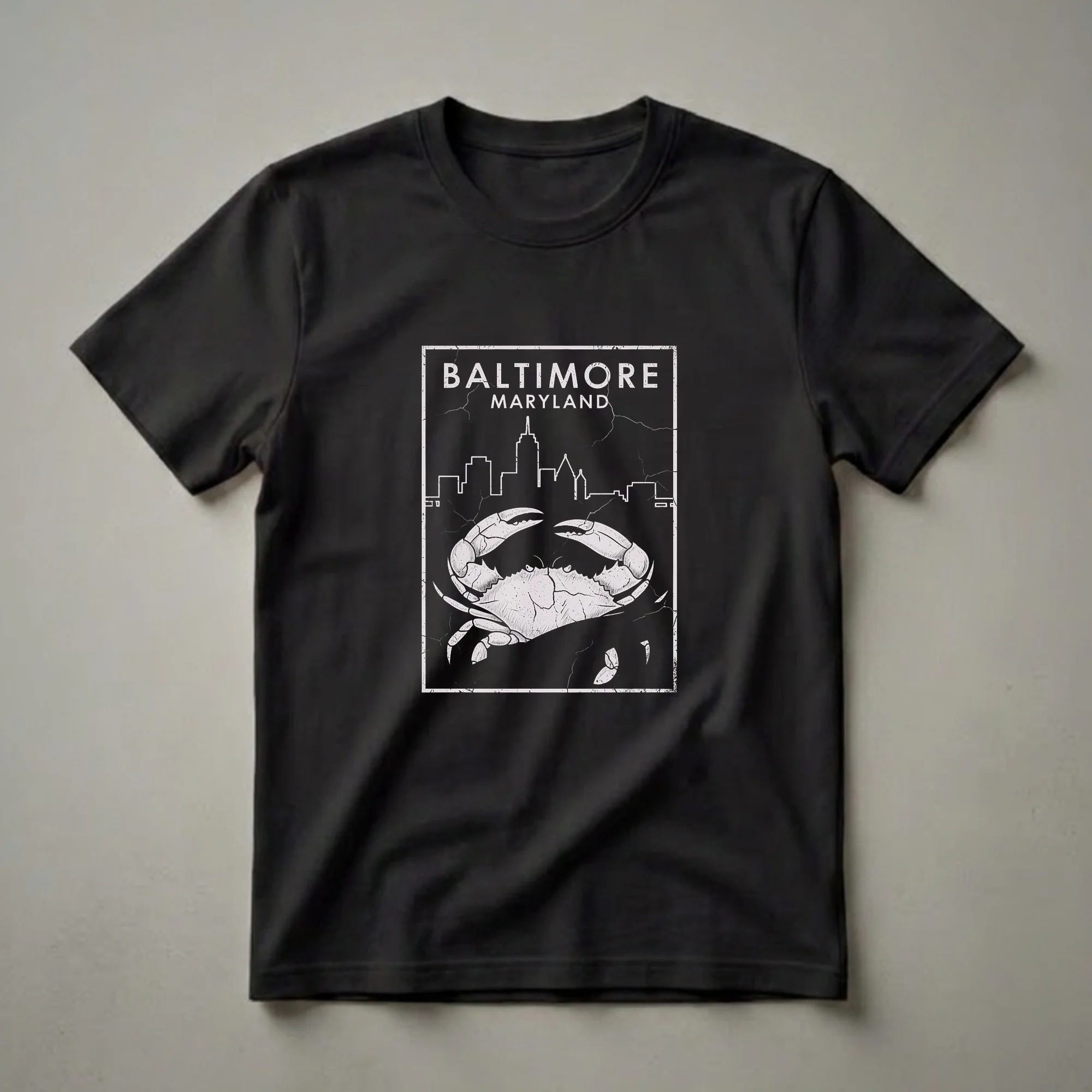 - Features a distressed blue crab and Baltimore skyline art.