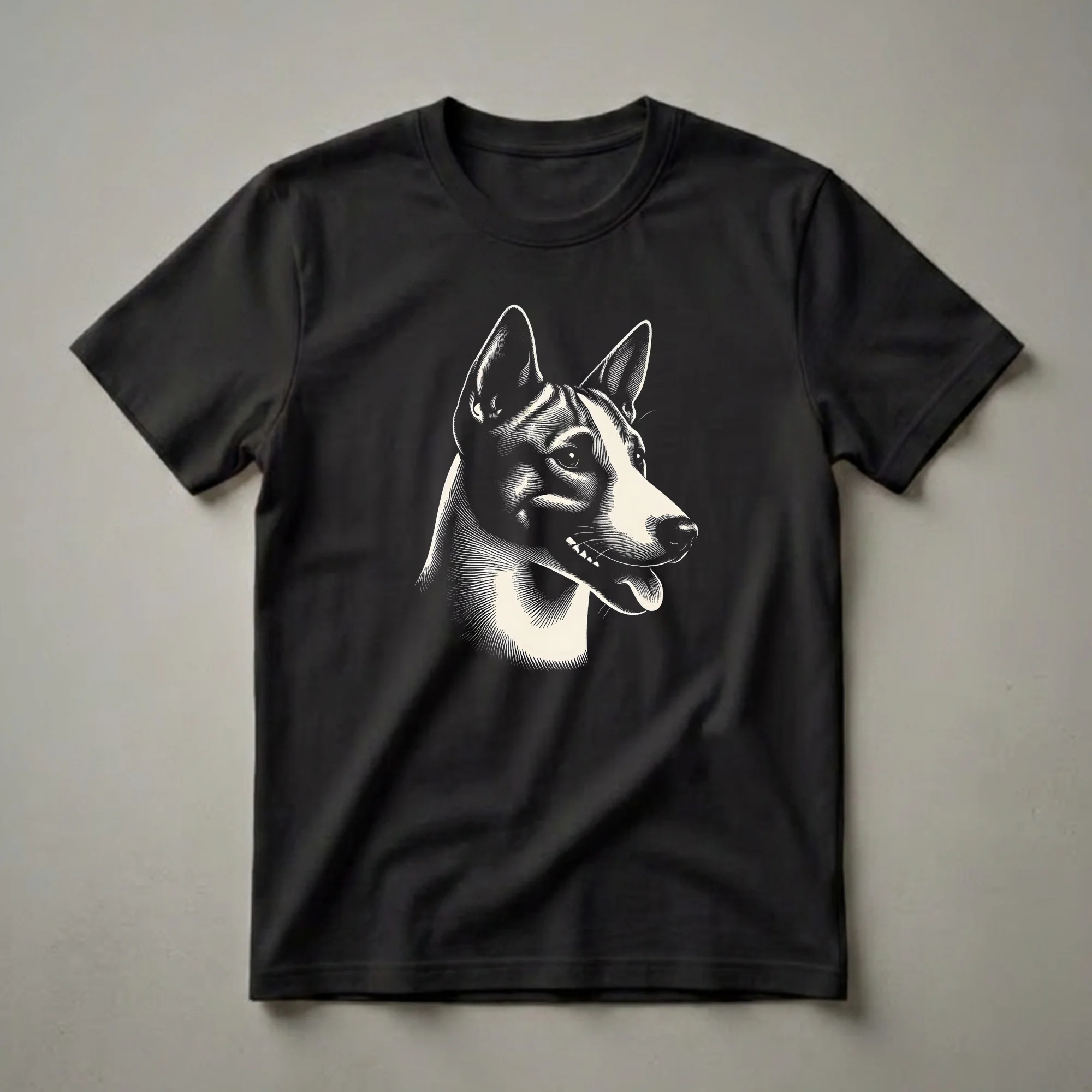 Basenji owners know the breed's unique characteristics, from their cat-like grooming habits to their distinctive "baroo" bark. This eye-catching t-shirt features a detailed, engraved-style illustration of a Basenji's face, rendered in striking black and white against a solid background. The intricate linework captures the alert expression and characteristic features of this African sighthound. This graphic tee is a thoughtful gift for any woman or man who cherishes their Basenji companion or admires the breed's independent spirit. It's a staple in the collection for those who appreciate unique dog art and want to wear their passion. This shirt works well for casual outings, dog park visits, or simply relaxing at home with your furry friend. The Basenji, originating from Central Africa, is known for its intelligence and playful nature, making this shirt a conversation starter among fellow dog enthusiasts. Wear this Basenji shirt to express your connection to this fascinating breed.