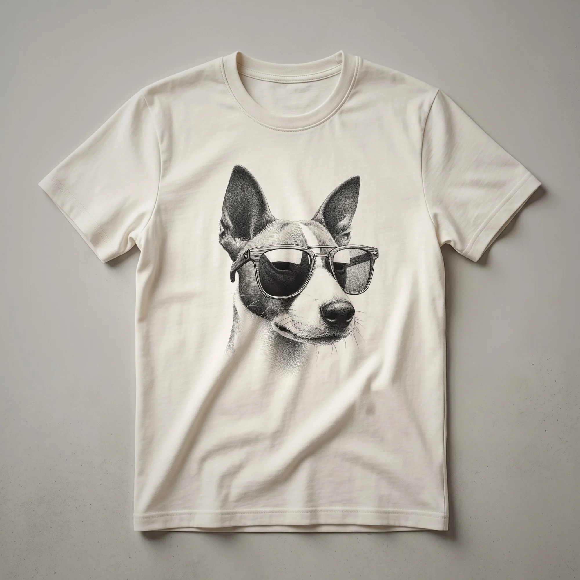 - Features a striking graphic of a Basenji wearing sunglasses.
