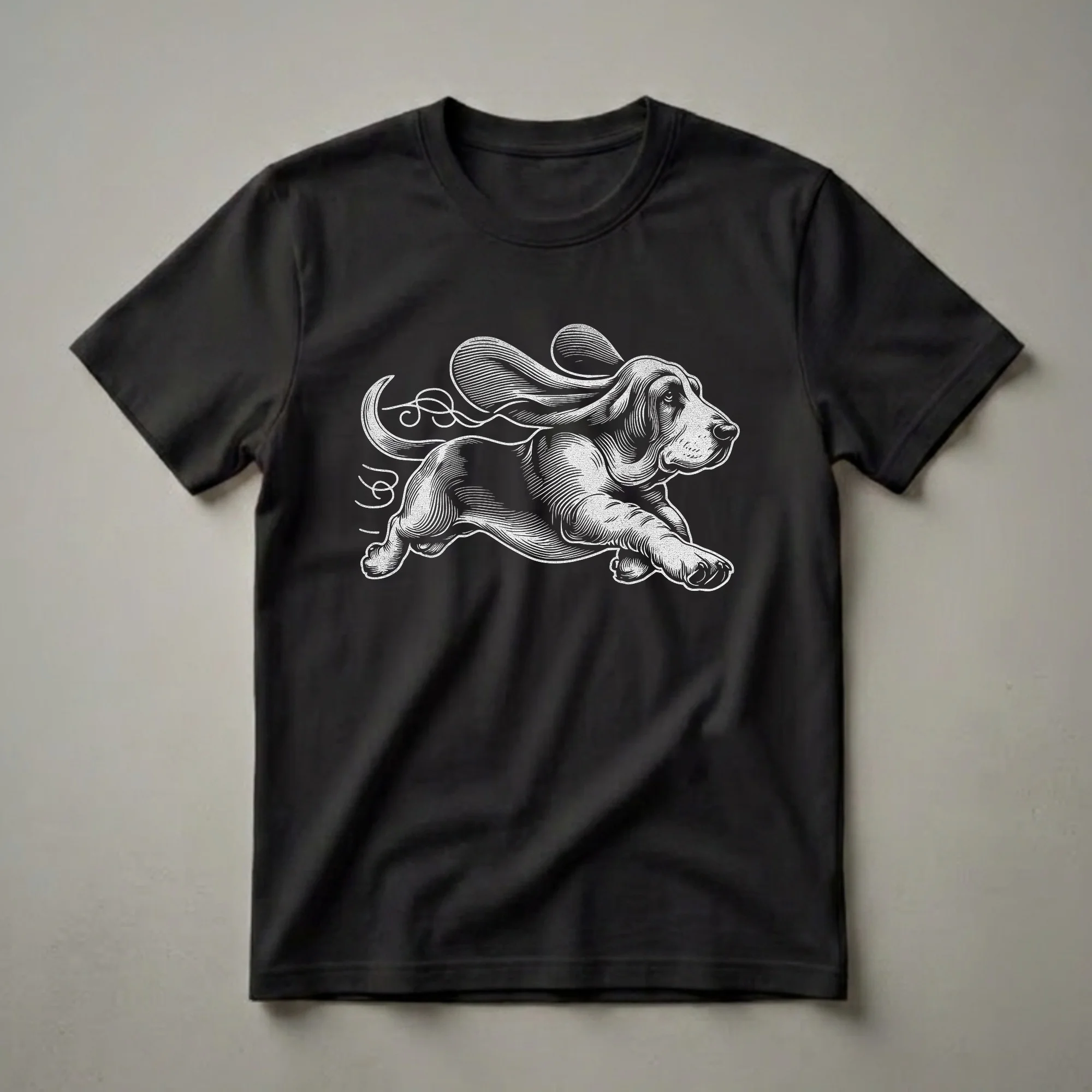Basset Hound owners know the unique charm and determined spirit of their beloved hounds. This striking graphic tee captures that essence with a dynamic illustration of a Basset Hound in full stride. The detailed line art, rendered in white against a black background, emphasizes the dog's flowing ears and tail as it moves with surprising speed. While often perceived as slow-moving, Basset Hounds possess a surprising endurance, a trait that resonates with runners and endurance athletes. This shirt is a fantastic way for dog moms and dads to express their passion for their breed and their active lifestyle. It's a staple in the collection for anyone who appreciates the blend of canine companionship and athletic pursuit. This tee works well for casual outings, post-run meetups, or simply lounging at home. Makes a thoughtful gift for the Basset Hound enthusiast in your life who also enjoys hitting the pavement or trails. Celebrate your furry running partner with this eye-catching apparel.