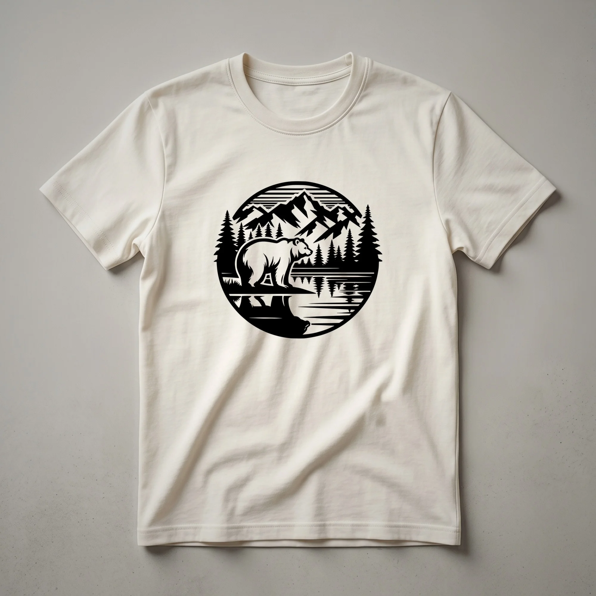 - Graphic t-shirt featuring a bear silhouette with a reflective mountain and tree scene.