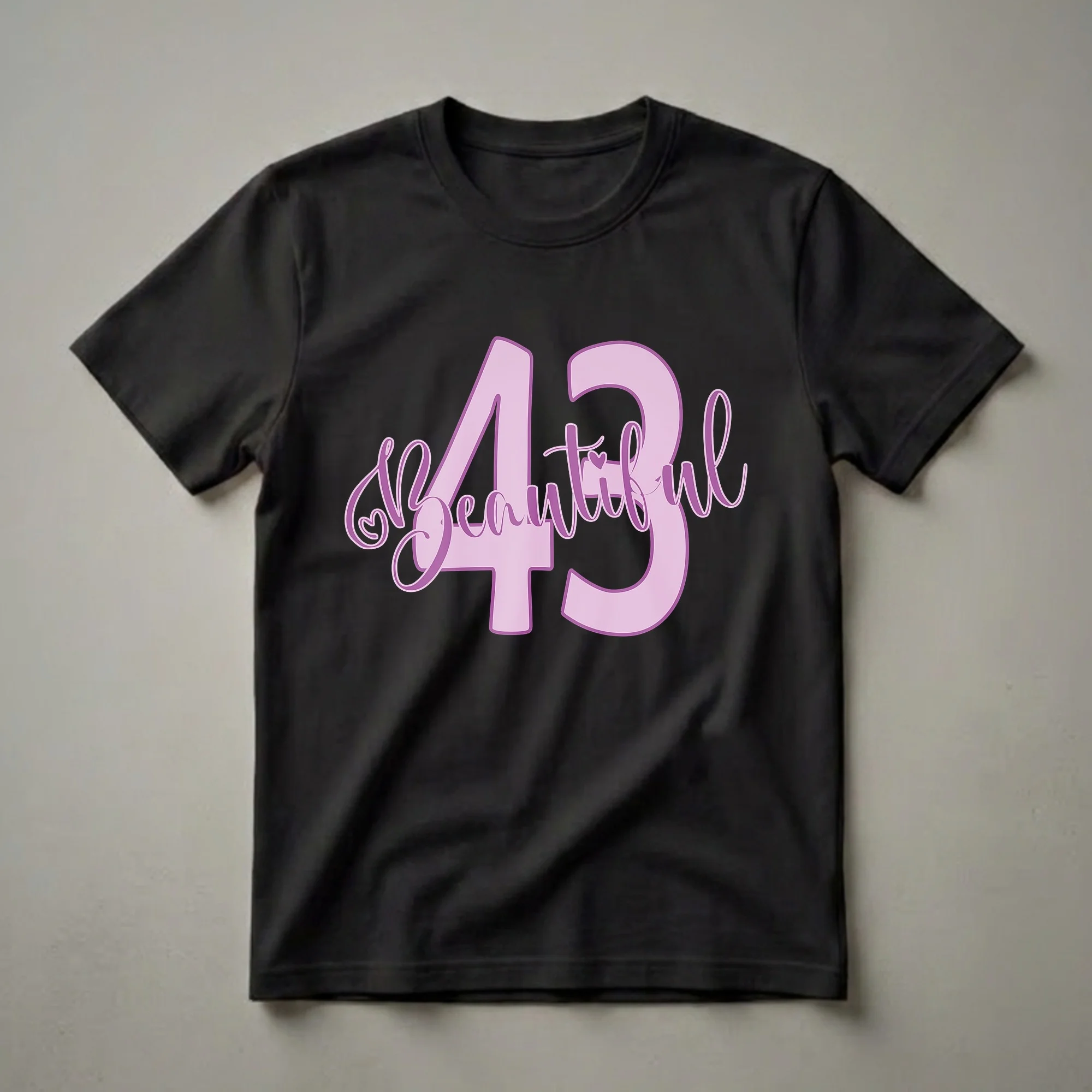 Forty-three is a significant milestone, marking a woman's continued journey through her vibrant 40s. This eye-catching graphic tee celebrates that special birthday with a bold display of the number '43' in a soft lavender hue, outlined in a deeper purple. Overlaying the large numerals is the word 'Beautiful,' rendered in an elegant script font, also in lavender with a purple outline. A small heart embellishes the 'i' in 'Beautiful,' adding a touch of feminine charm. This t-shirt is a wonderful way for any woman turning 43 to express her joy and confidence on her special day. It's a staple in the collection for birthday celebrations, whether she's heading to a party, brunch, or a casual get-together with friends and family. This shirt makes a thoughtful gift for a wife, sister, mother, or friend who is entering this exciting chapter of her life. She will reach for this tee to commemorate her 43rd year with style and flair.
