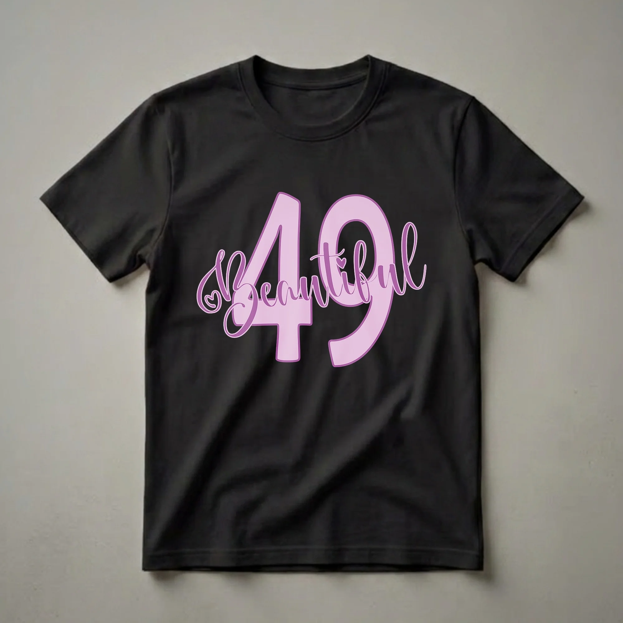 Women celebrating their 49th birthday will love this 'Beautiful 49' graphic tee. The design features the prominent number 49 in a soft lavender hue, with the word 'Beautiful' elegantly scripted across it. Small heart details add a touch of charm to this eye-catching apparel. Turning 49 is a significant milestone, often marking the final year of one's forties and a transition into a new decade. This t-shirt serves as a stylish way for women to embrace this age with confidence and flair. It's a wonderful gift idea for a wife, mother, sister, or friend who is about to reach this exciting birthday. Imagine her wearing this shirt to her birthday dinner, a casual brunch with friends, or a celebratory party. This comfortable tee is a go-to for any woman who wants to showcase her birthday spirit. It's more than just clothing; it's a statement of joy and self-appreciation for reaching this fabulous age. This shirt makes a thoughtful gift for any woman turning 49.