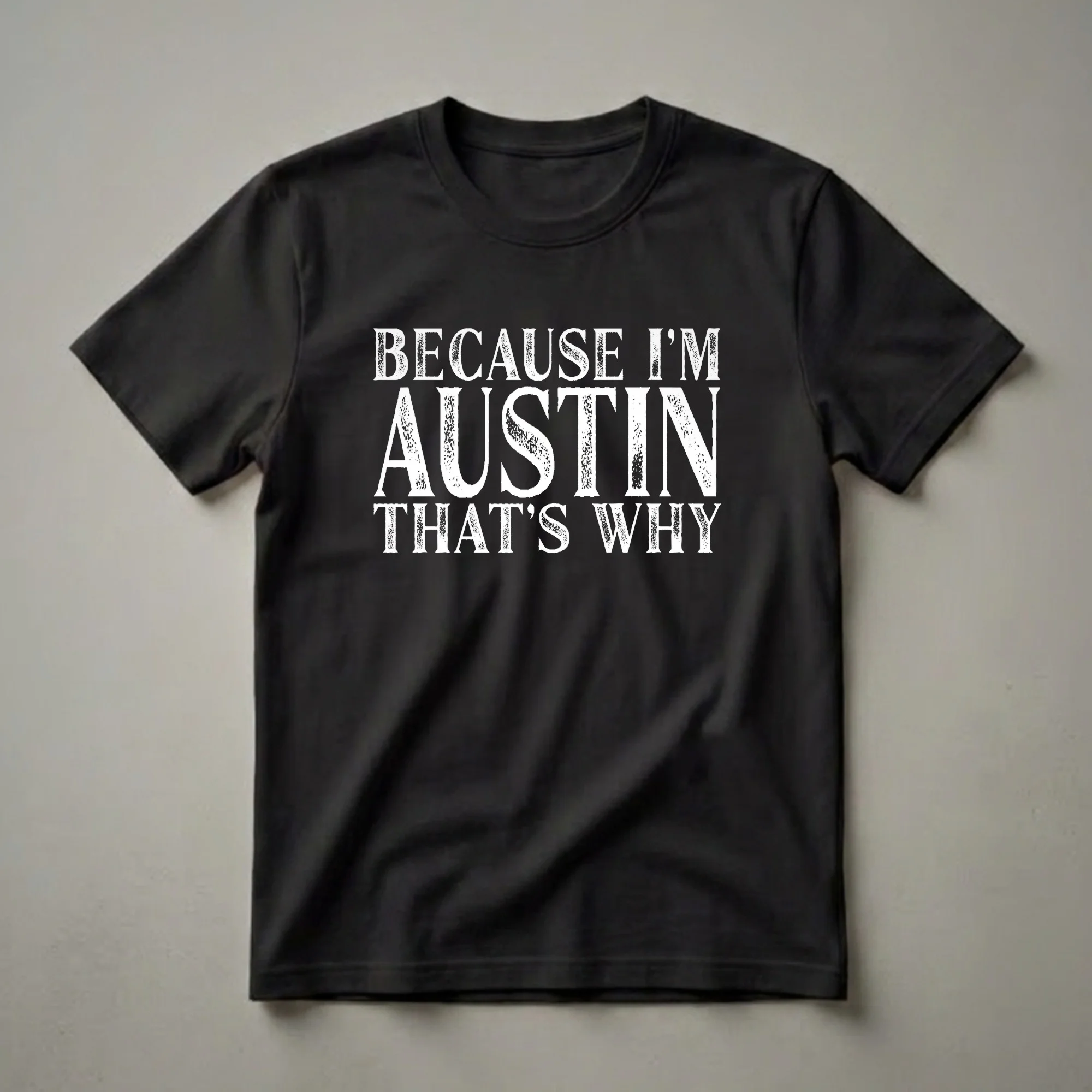 - Personalized 'Because I'm Austin That's Why' graphic tee for men.