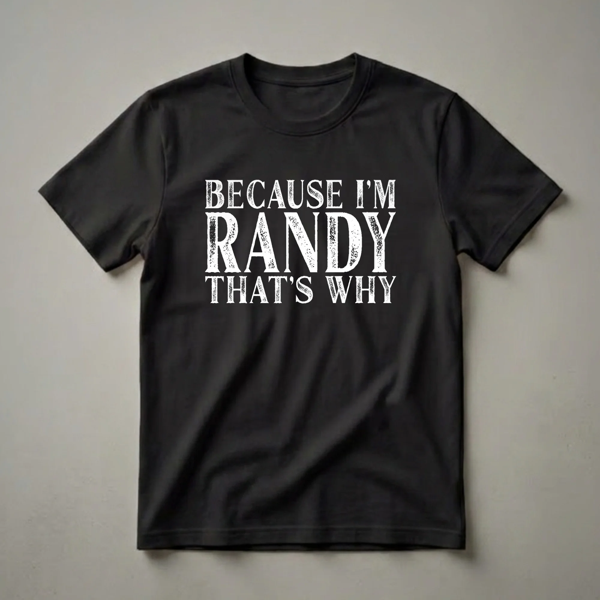 Randy, this graphic tee is for you. The design features bold, distressed white lettering that clearly states, "BECAUSE I'M RANDY THAT'S WHY." This shirt is a straightforward declaration for anyone named Randy who enjoys a bit of humor and personal pride. It’s a staple in any casual wardrobe, a thoughtful choice for everyday wear or for making a statement at gatherings. This t-shirt works well for Randy himself, or as a thoughtful gift for a friend or family member named Randy. Imagine Randy wearing this shirt to a casual birthday celebration or a relaxed weekend outing. It’s a conversation starter and a way to embrace one's identity with a touch of wit. The distressed font adds a vintage, rugged feel to the overall design, making it eye-catching. This apparel is a go-to tee for anyone who wants to express their name with a playful attitude. It’s a simple yet effective way to showcase individuality and a sense of humor, making it a unique addition to any collection.