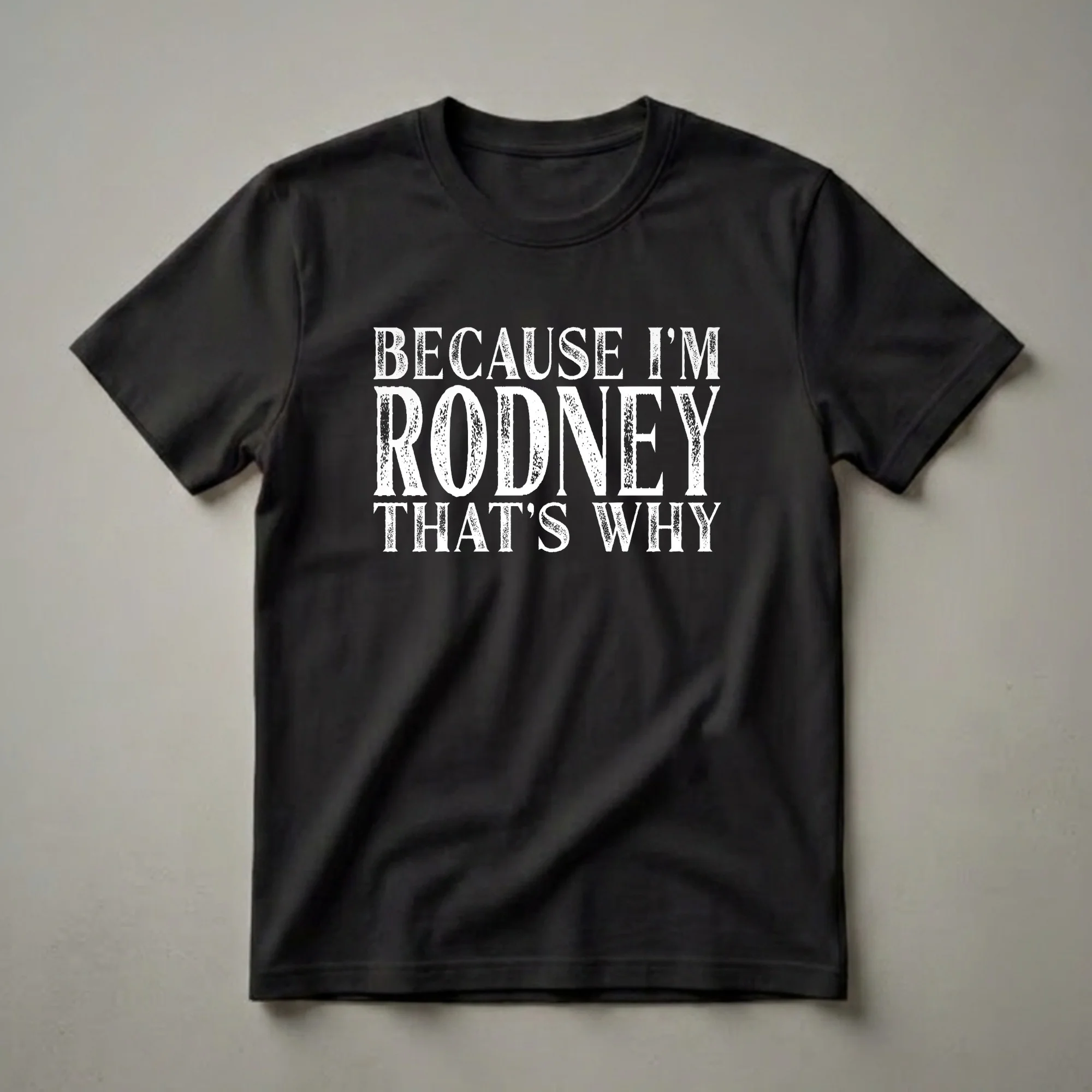 - A black graphic tee featuring bold, distressed white lettering that proudly declares 'BECAUSE I'M RODNEY THAT'S WHY'.