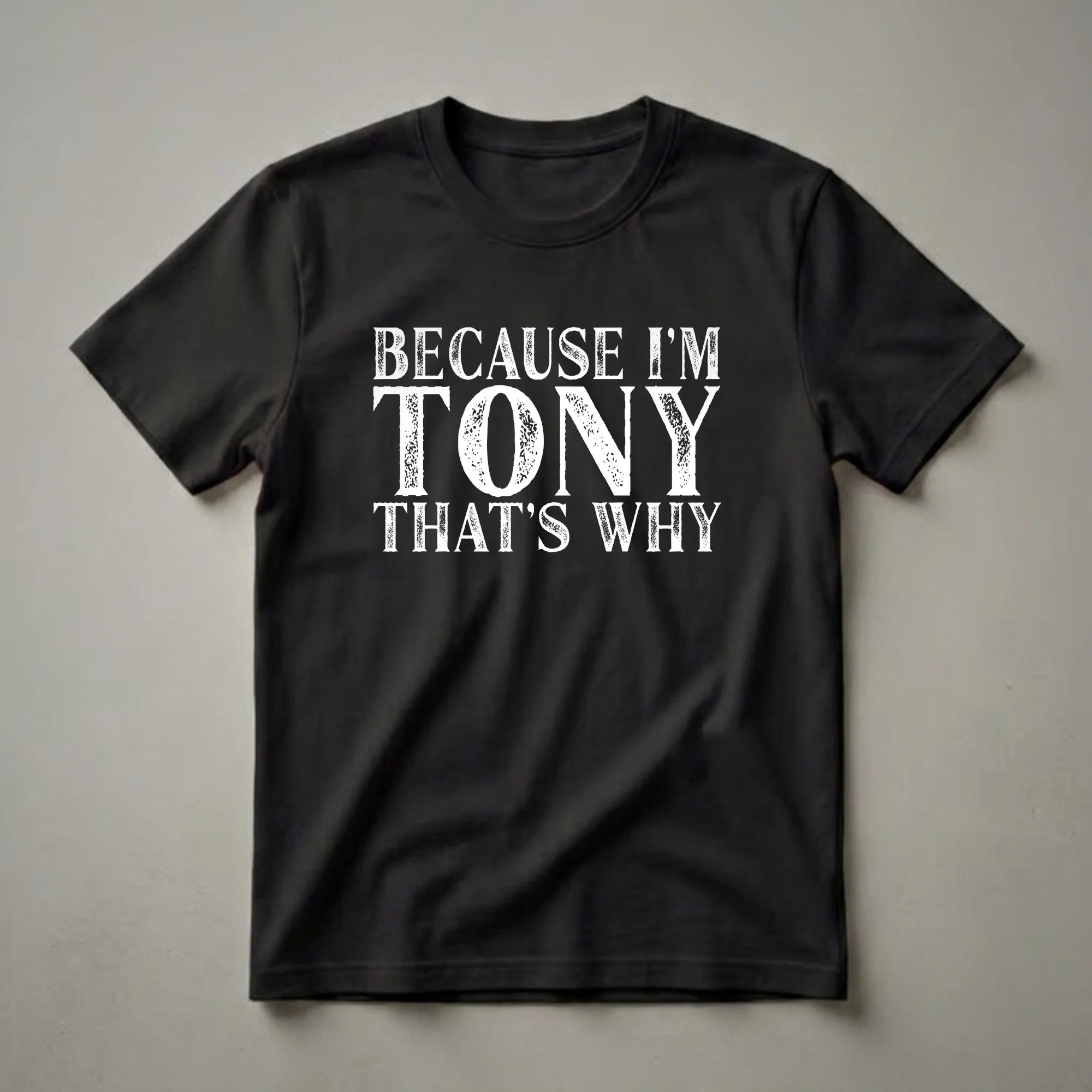- Personalized "Because I'm Tony That's Why" graphic tee for men named Tony.