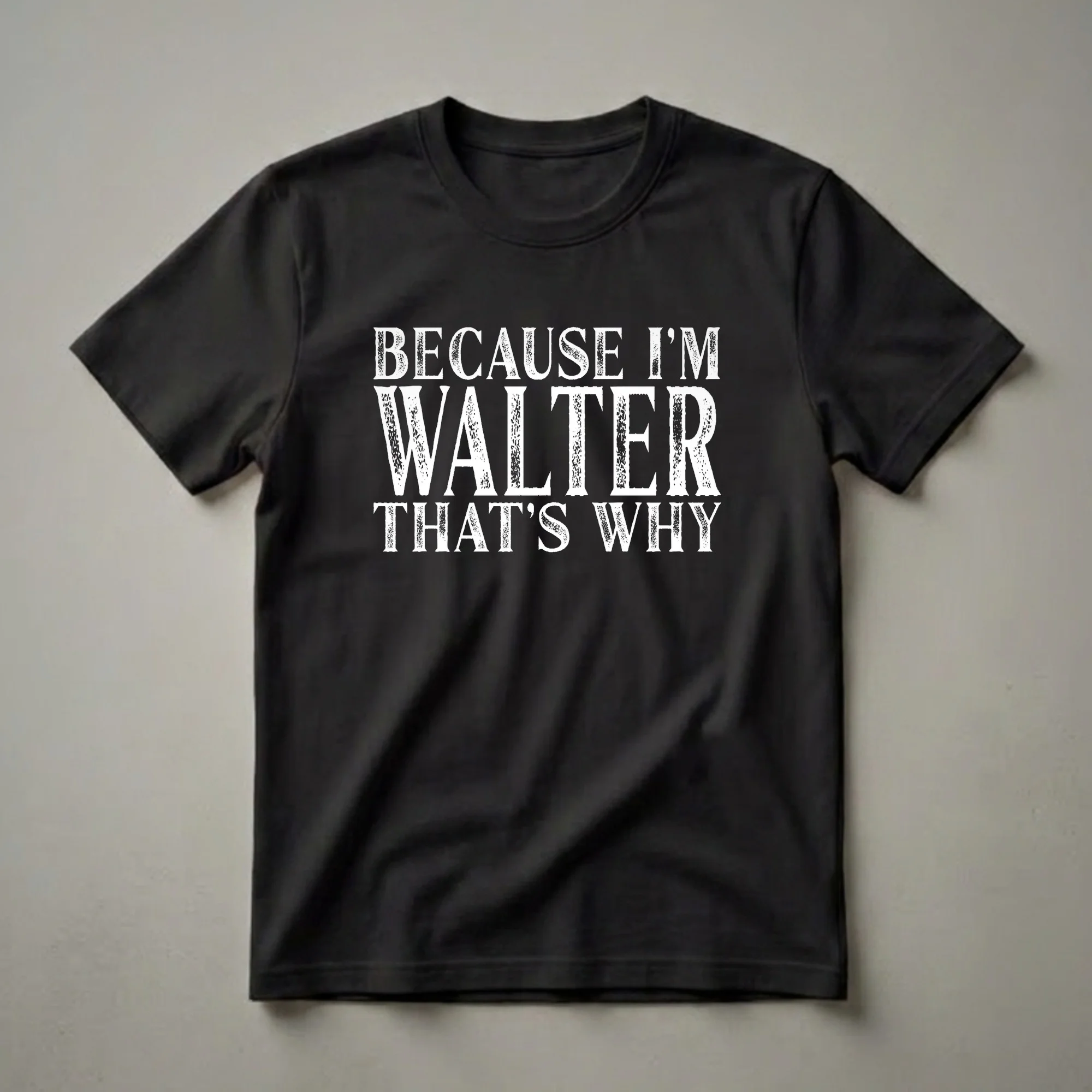Walter, the name itself carries a certain gravitas, and this t-shirt proudly proclaims it. The bold, distressed white lettering stands out against the dark background, making a clear statement: 'BECAUSE I'M WALTER THAT'S WHY.' This graphic tee is a straightforward declaration for anyone named Walter who enjoys a bit of humor and personality in their apparel. It’s a conversation starter, a way to own your identity with a touch of playful confidence. This shirt works well for Walter himself, or as a thoughtful gift for a friend, family member, or colleague named Walter. Imagine Walter wearing this to a casual birthday gathering, a family reunion, or just on a relaxed weekend. It’s a staple in the collection for any Walter who appreciates a personalized touch and a good laugh. This tee is a go-to for expressing individuality and celebrating the name Walter with pride. It’s a simple yet effective way to showcase a unique identity, making it a memorable piece of clothing for any occasion where Walter wants to be recognized.