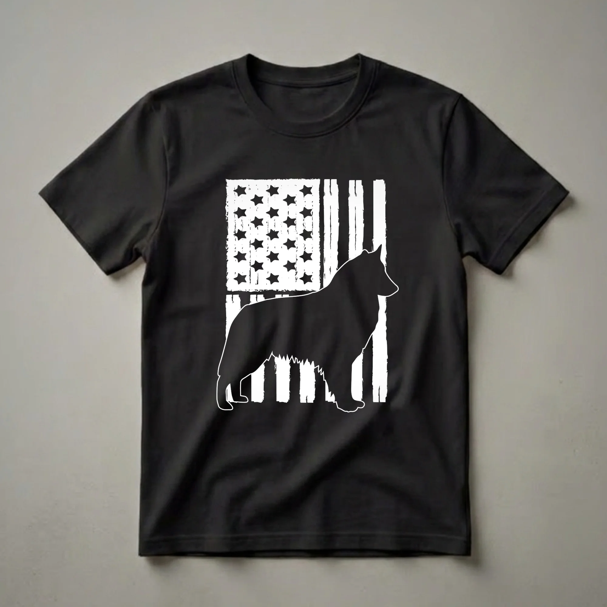 Belgian Sheepdog owners who cherish their intelligent and protective companions will appreciate this striking graphic tee. The design features a bold black silhouette of a Belgian Sheepdog, captured in profile, standing proudly against a distressed American flag. The flag's stripes are rendered with a textured, brushstroke effect, and the stars are solid black shapes, creating a vintage, rugged aesthetic. This t-shirt is a fantastic way for any Belgian Sheepdog mom or dad to showcase their national pride and their devotion to their four-legged family member. Belgian Sheepdogs, known for their versatility and keen intelligence, were originally bred as herding dogs in Belgium. This shirt works well for casual outings, dog park visits, or patriotic holidays. It makes a thoughtful gift for the Belgian Sheepdog enthusiast in your life who loves to express their passion for their breed and their country. This apparel is a staple for any dog lover's wardrobe.