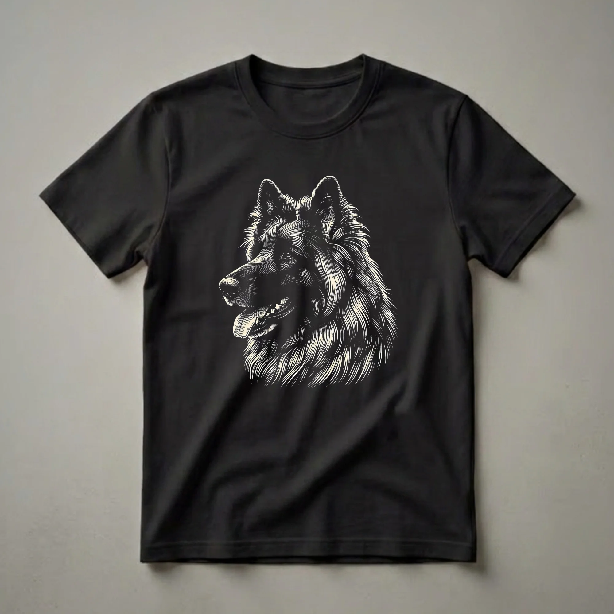 Showcase your love for the intelligent Belgian Tervuren with this striking black and white scratchboard art t-shirt. This eye-catching graphic tee features a detailed scratchboard-style illustration of a Belgian Tervuren's head in profile, capturing its alert expression and distinctive fur. The art style uses fine lines to create depth and texture, making the dog's features stand out against a dark background. The Belgian Tervuren, originating from Belgium, is a breed known for its agility and herding capabilities, often used as guard dogs and in canine sports. This shirt is a thoughtful gift for any Belgian Tervuren mom or dad who appreciates unique dog art. It's a staple in the collection for those who want to wear their canine passion. This t-shirt works well for casual outings, dog park visits, or simply relaxing at home with your furry companion. Celebrate the bond you share with your Belgian Tervuren with this distinctive piece of apparel, a true testament to the breed's noble presence.