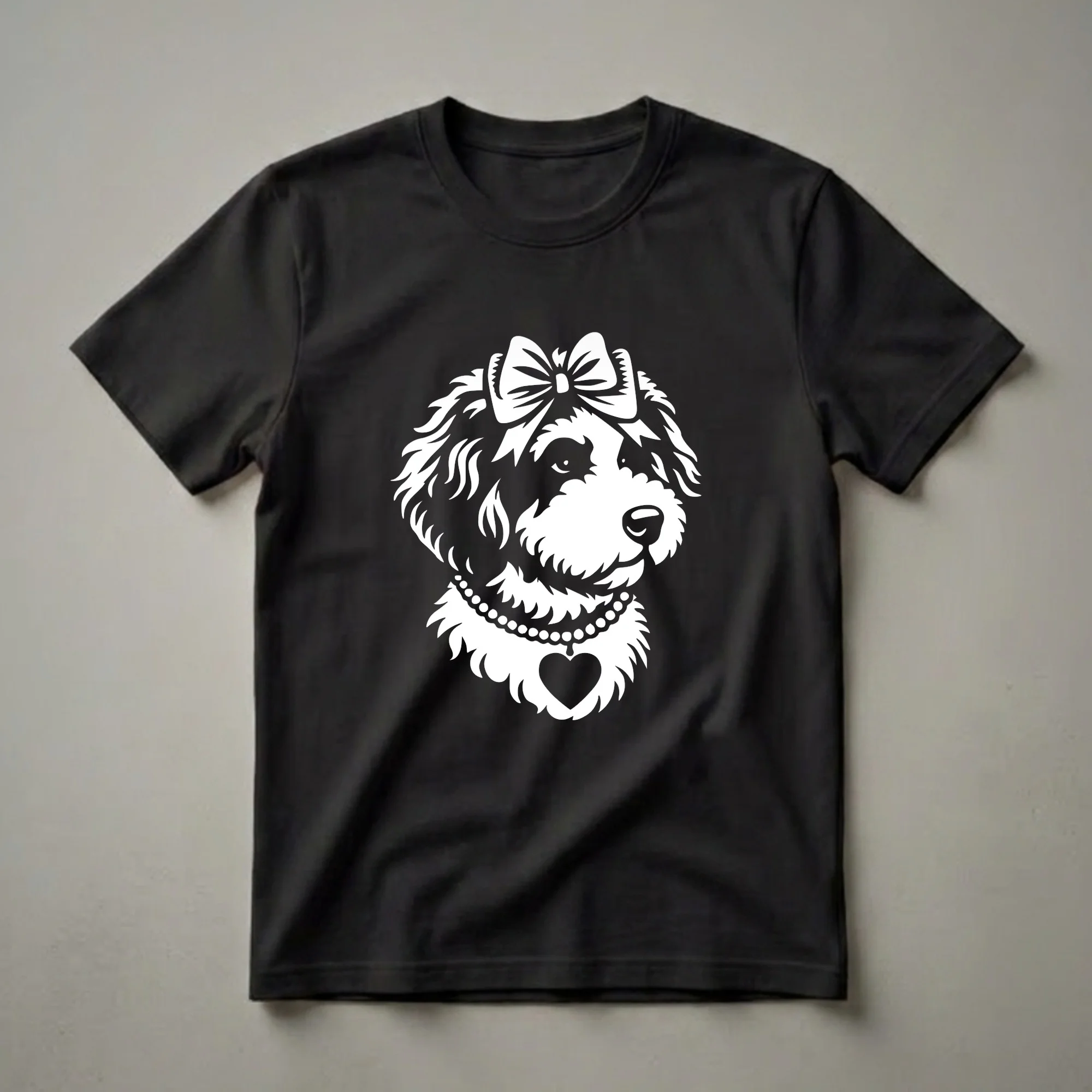 Bernedoodle moms know the joy these intelligent and affectionate dogs bring into a home. This eye-catching graphic tee features a stylized white illustration of a Bernedoodle's head, complete with a charming bow atop its head and a pearl necklace adorned with a heart pendant. The design captures the breed's friendly demeanor and playful spirit. Bernedoodles, a cross between a Bernese Mountain Dog and a Poodle, are known for their gentle nature and hypoallergenic coats, making them a popular choice for families. This t-shirt is a wonderful way for any Bernedoodle owner to express their affection for their furry companion. It makes a thoughtful gift for birthdays, holidays, or just because for the dog lover in your life. Wear this comfortable shirt to your next dog park visit or casual outing and let your love for your Bernedoodle shine. This graphic shirt is a staple for any dog enthusiast's wardrobe. This tee is a go-to for daily wear.
