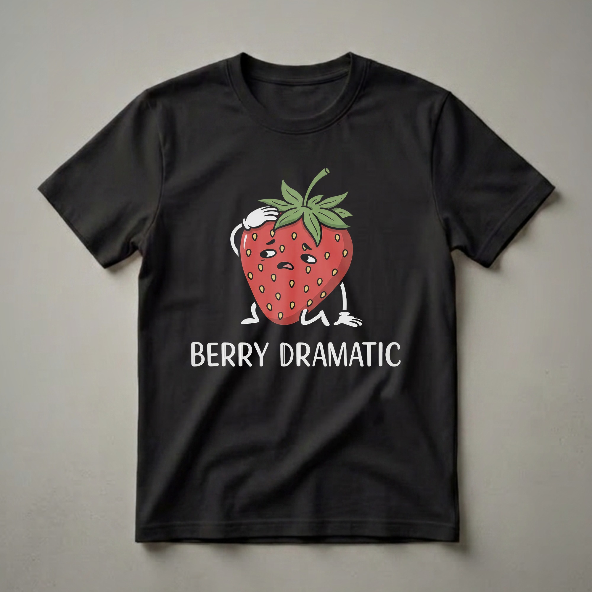 Strawberries, known for their vibrant red color and sweet taste, are a beloved fruit enjoyed worldwide. This graphic tee captures a humorous take on the fruit, featuring a cartoon strawberry with a distressed expression, complete with white cartoon gloves and the text 'BERRY DRAMATIC' emblazoned below. The design uses a classic cartoon style, reminiscent of early animation, giving it a nostalgic yet playful feel. This shirt is a thoughtful gift for anyone who appreciates a good pun and has a love for food, especially fruits. It's a staple in the collection for those who enjoy a bit of humor in their wardrobe. This tee works well for casual outings, game nights, or simply lounging at home. The strawberry itself, scientifically classified as an aggregate accessory fruit, is native to the Northern Hemisphere and is cultivated globally for its delicious flavor and nutritional benefits. This eye-catching design is sure to bring a smile to anyone's face, making it a go-to tee for expressing a playful personality.