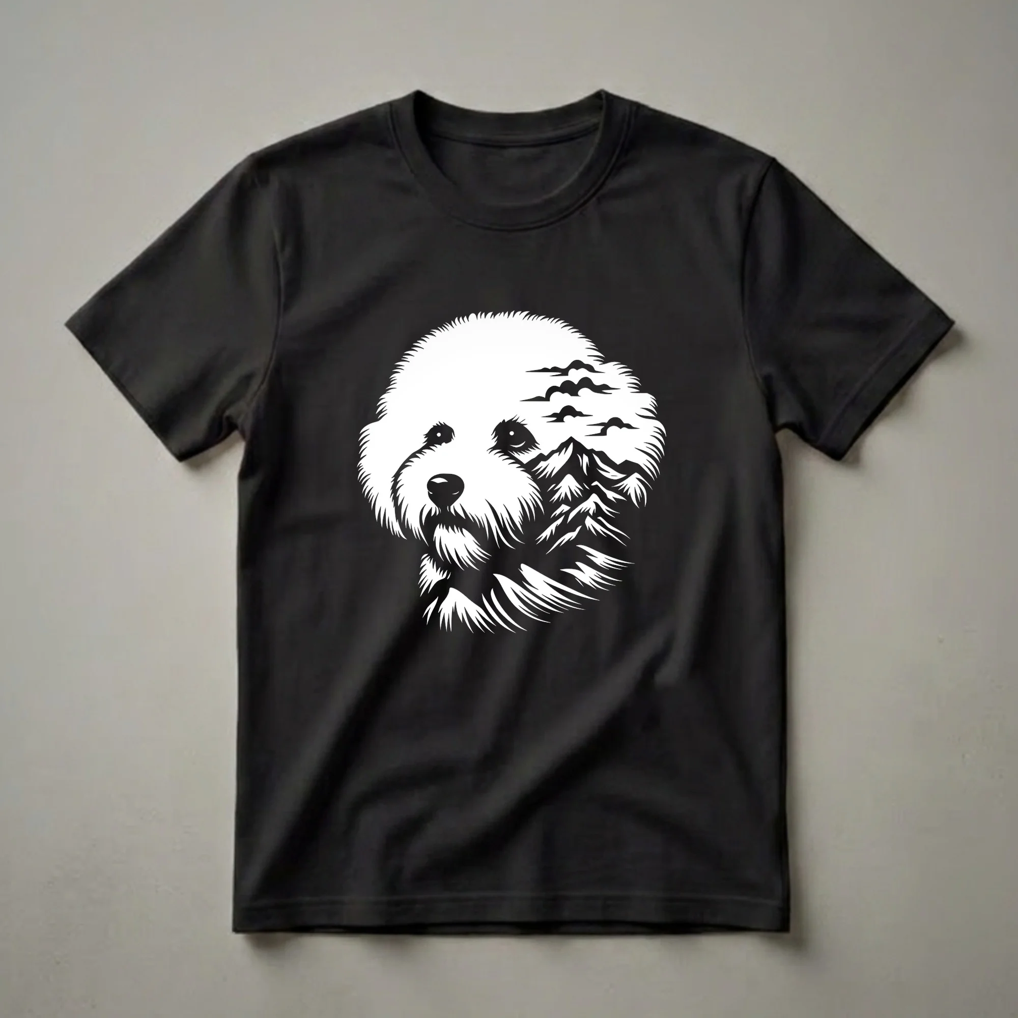 Bichon Frise owners who appreciate the breed's cheerful disposition and fluffy white coat will adore this artistic t-shirt. The design cleverly merges the iconic silhouette of a Bichon Frise's face with a majestic mountain range and scattered clouds, creating a striking visual that speaks to both canine companionship and a love for the outdoors. Bichon Frises, originating from the Mediterranean region, are known for their playful and affectionate nature, making them a beloved breed worldwide. This graphic tee is more than just apparel; it's a statement piece for those who find joy in their furry friends and the serenity of nature. Imagine wearing this eye-catching shirt on a hike, to a casual brunch, or simply while relaxing at home with your beloved pet. It makes a thoughtful gift for any Bichon Frise mom or dad who cherishes their dog's unique personality and enjoys unique, nature-inspired art. This shirt is a go-to for expressing your passion for this charming breed.