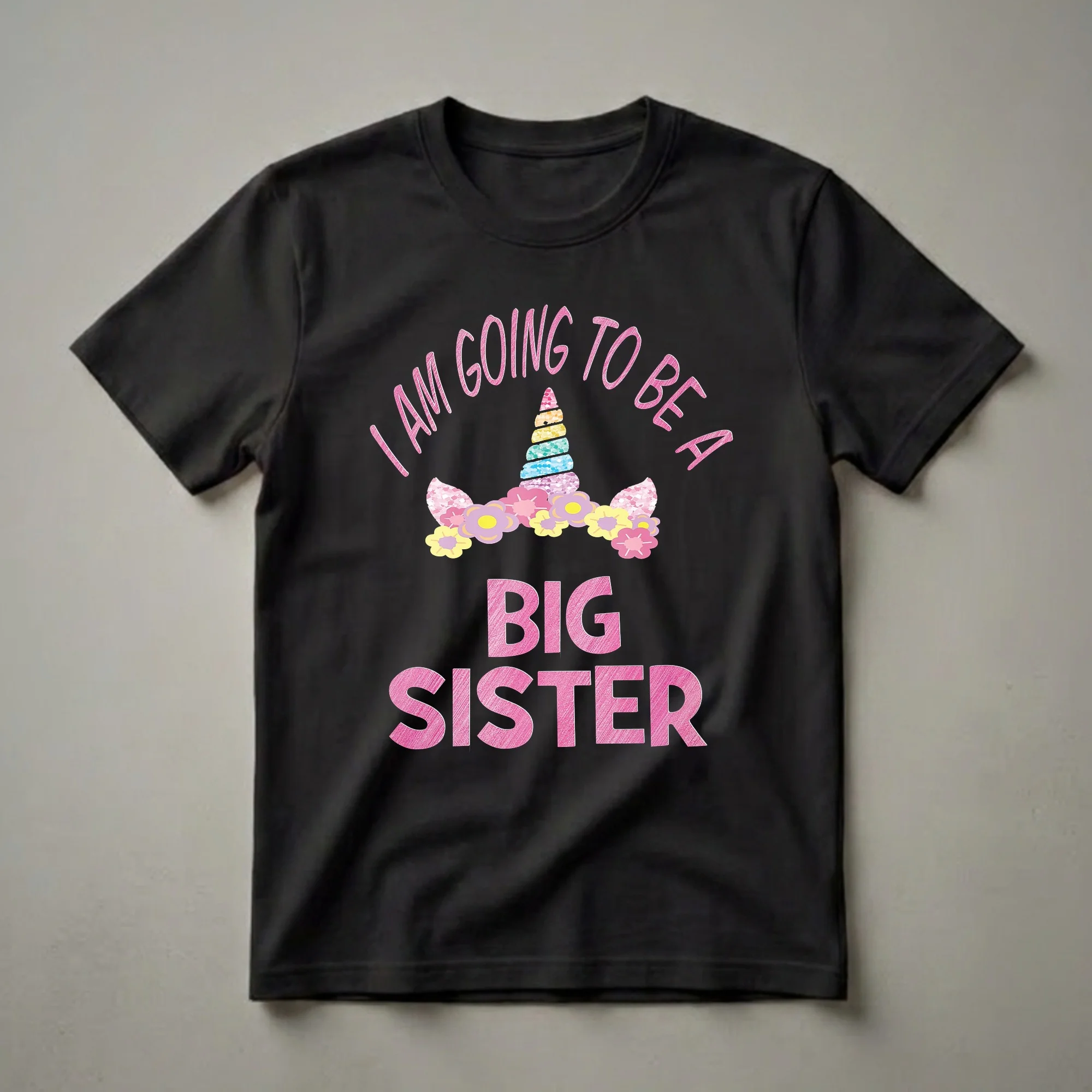 Announcing a new sibling is an exciting time, and this "I Am Going To Be A Big Sister" unicorn tee captures that joy. The design showcases a vibrant, rainbow-striped unicorn horn adorned with a crown of pink, purple, and yellow flowers, complete with sparkling pink leaves. Below this magical imagery, the words "BIG SISTER" are emblazoned in bold, textured pink lettering, while the phrase "I AM GOING TO BE A" arches gracefully above the unicorn horn. This graphic t-shirt is a wonderful way for a young girl to express her upcoming role as a big sister. It's a thoughtful gift for any girl who loves unicorns and is anticipating the arrival of a new baby brother or sister. She will reach for this shirt to wear to family gatherings, doctor's appointments, or just around the house as she prepares for her new sibling. This tee is a fun and memorable way to celebrate this special family milestone.