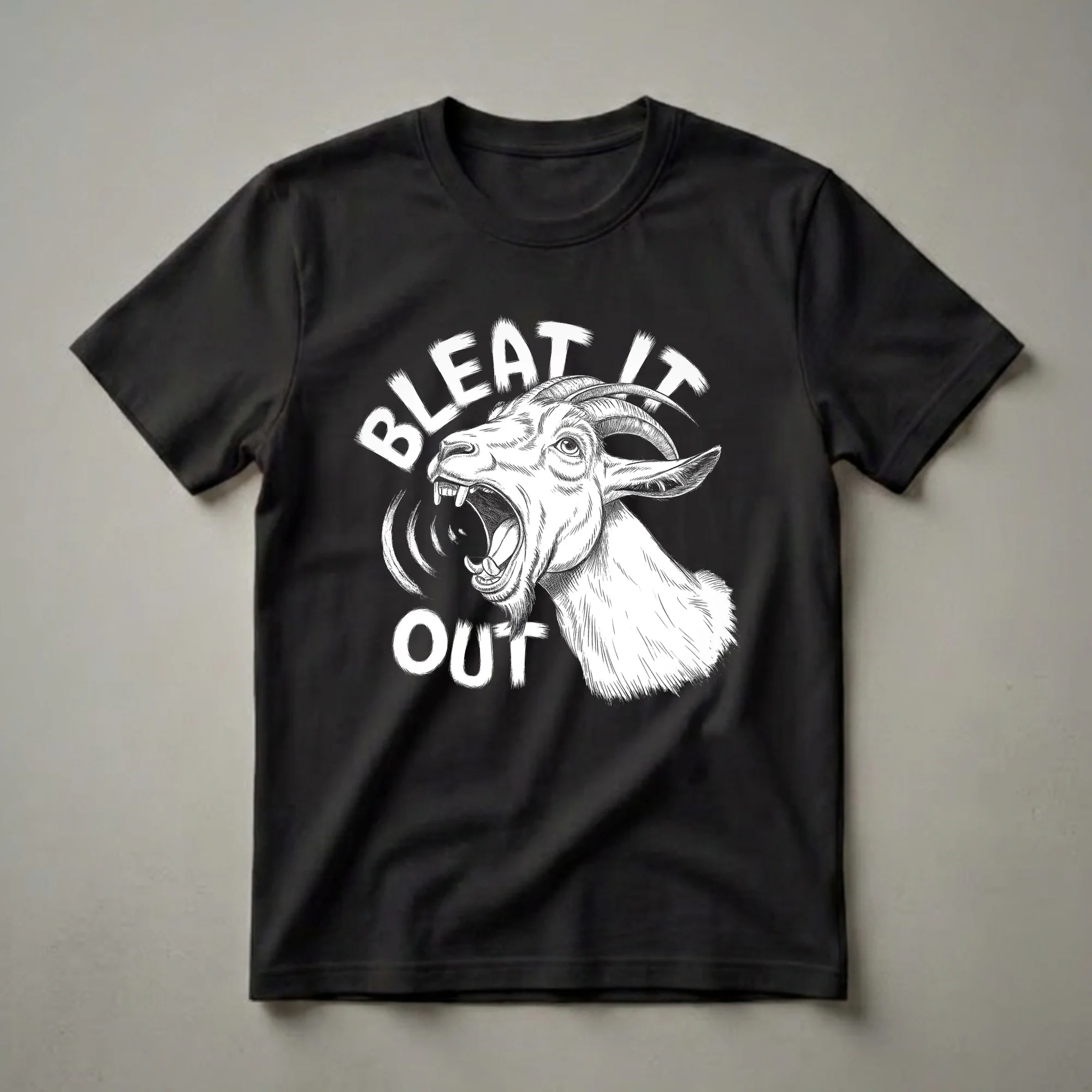 Goats are known for their distinctive vocalizations, and this graphic tee captures that spirit with a humorous twist. The design features a detailed, black and white sketch of a goat's head, its mouth wide open in a powerful bleat. The text 'BLEAT IT OUT' is rendered in a bold, brushstroke style, emphasizing the loud and expressive nature of the artwork. This shirt is a thoughtful choice for individuals who aren't afraid to express themselves loudly and with a sense of humor. Goats, scientifically classified as Capra aegagrus hircus, are domesticated ruminants found worldwide, often celebrated for their independent and sometimes stubborn personalities. This t-shirt makes a thoughtful gift for the friend or family member who has a boisterous laugh, a loud opinion, or simply enjoys a good animal pun. It's a staple in the collection for anyone who appreciates quirky and eye-catching apparel. Wear this tee to your next game night, casual get-together, or just when you want to bring a smile to people's faces with its playful and energetic design. This shirt is a conversation starter, well suited for those who enjoy a bit of animal-themed fun.