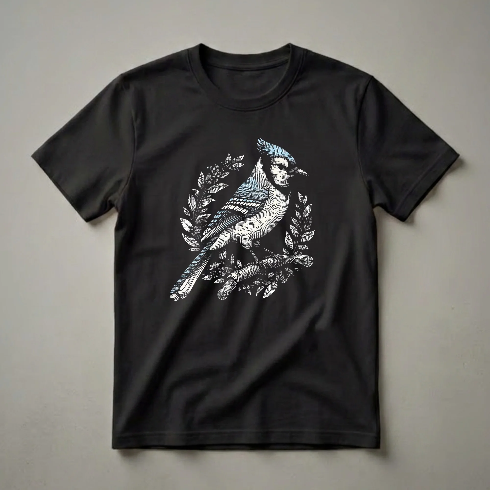 This striking graphic tee features a detailed linocut-style illustration of a vibrant Blue Jay perched on a rustic branch. The artwork is rendered in a classic black and white with subtle blue accents highlighting the bird's distinctive crest, wings, and tail feathers. Surrounding the central figure is a delicate wreath of leaves and berries, adding a touch of natural elegance to the design. Blue Jays are known for their intelligence and bold personalities, often found in eastern and central North America. They are omnivores, with a diet that includes nuts, seeds, insects, and even smaller birds' eggs. This shirt is a wonderful way for birdwatchers, ornithology enthusiasts, or anyone who appreciates the beauty of nature to express their passion. It makes a thoughtful gift for friends or family who enjoy the outdoors and the diverse avian life around them. Wear this unique t-shirt to your next birdwatching excursion, a nature walk, or simply as a conversation starter on casual outings. This comfortable tee is a staple for any nature lover's wardrobe.