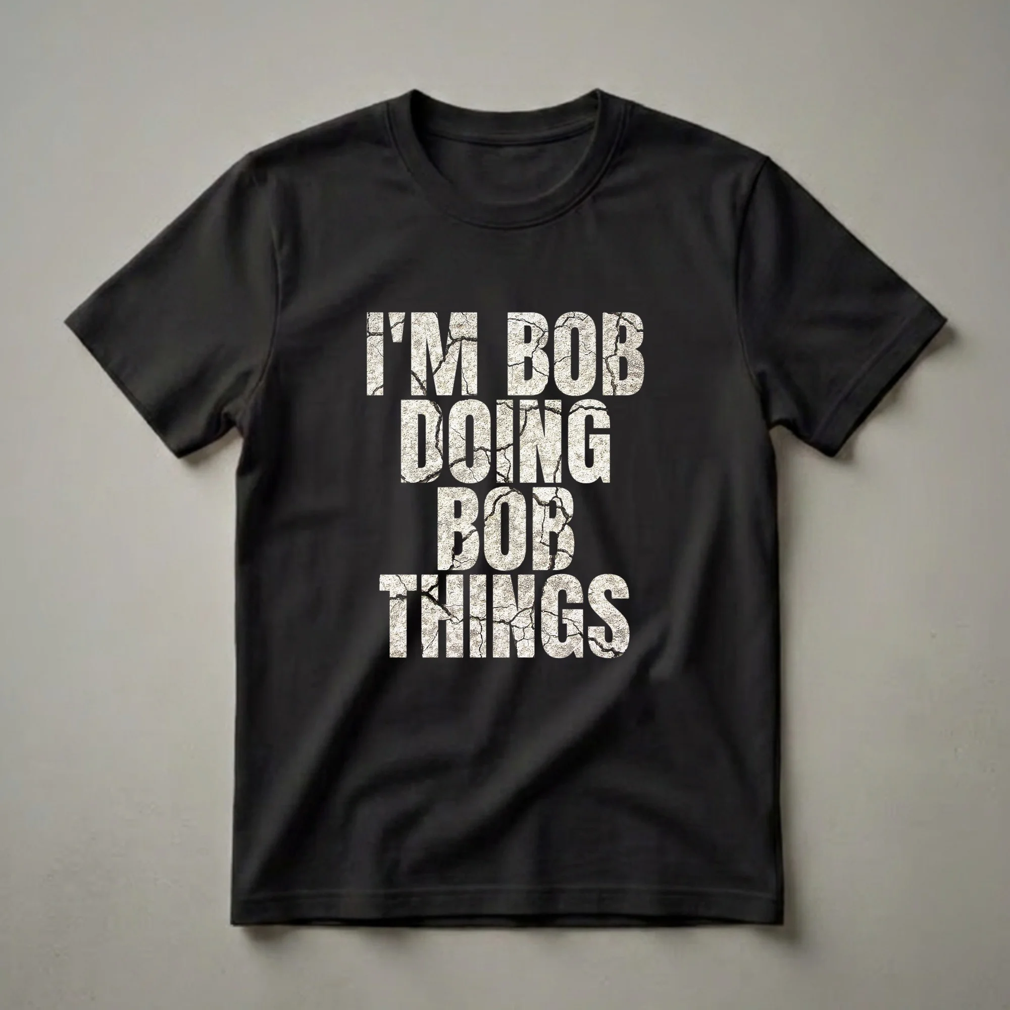 For every Bob who embraces their individuality and enjoys their own unique pursuits, this "I'm Bob Doing Bob Things" graphic tee is a statement piece. The bold, distressed lettering, resembling cracked earth or stone, stands out against the solid black background, conveying a sense of rugged authenticity. This t-shirt is more than just apparel; it's a declaration of self. It speaks to the man who knows what he likes and isn't afraid to do it, whether that involves tinkering in the garage, enjoying a quiet afternoon, or pursuing a personal passion. The design is straightforward yet impactful, making it a go-to tee for casual outings, family gatherings, or just relaxing at home. It’s a thoughtful gift for any Bob in your life, from a father or brother to a friend or husband, celebrating their distinct character. This shirt works well for men who appreciate humor and a touch of rugged style in their wardrobe. It’s a conversation starter and a fun way to express a laid-back attitude. Anyone named Bob will reach for this tee when they want to showcase their personal brand of 'Bob-ness' with a smile. This shirt is a staple in the collection for those who own their identity.