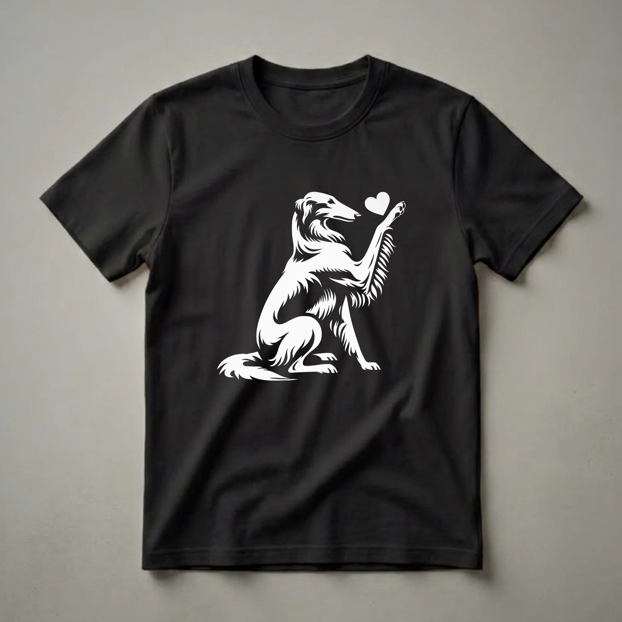 - Features a unique white graphic of a Borzoi dog reaching for a heart.