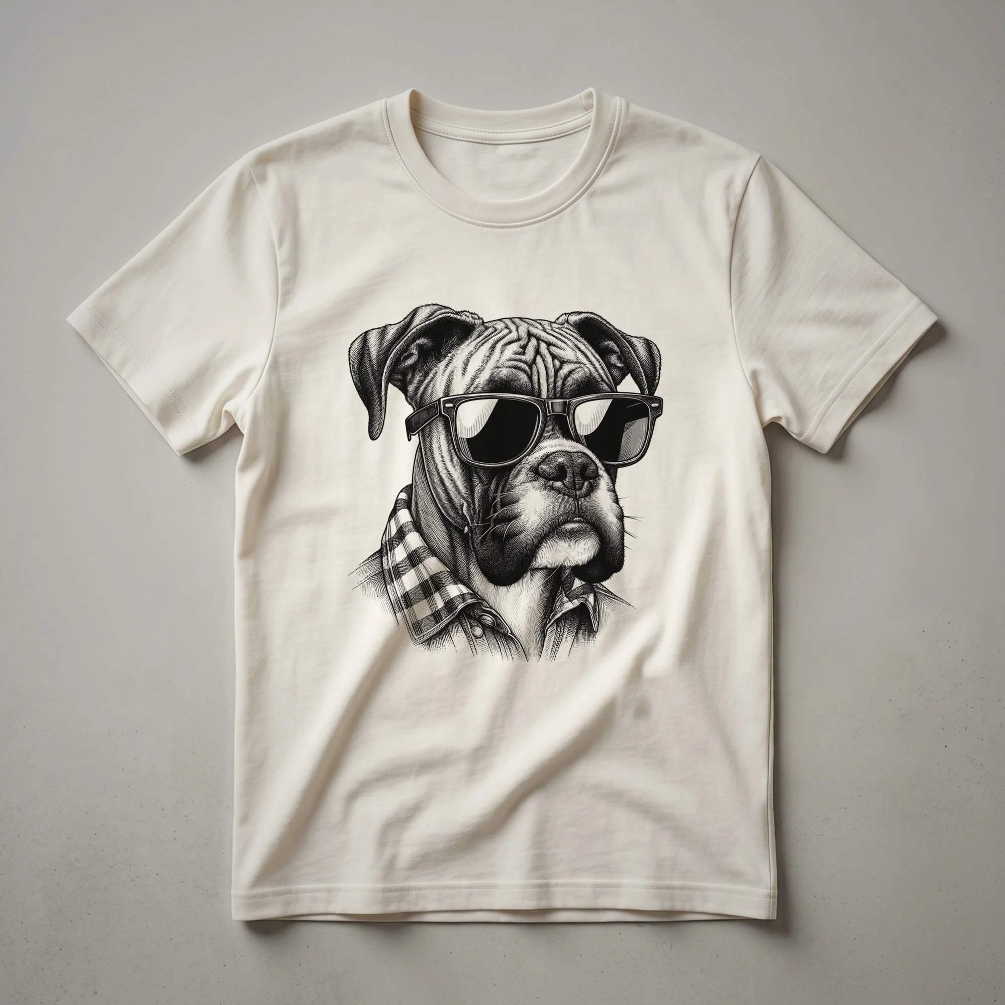 Boxer dog dads who appreciate a touch of cool will reach for this eye-catching graphic tee. The design showcases a Boxer dog sporting a pair of stylish sunglasses, embodying a laid-back and confident canine persona. Boxers, known for their energetic and playful nature, often display a unique charm that resonates with their owners. This shirt captures that spirit, making it a standout piece for any dog dad. It's a thoughtful gift for the man who considers his Boxer a true member of the family, perhaps for his birthday or Father's Day. Imagine him wearing this t-shirt on a casual weekend outing, a trip to the dog park, or while relaxing at home with his furry companion. This apparel is more than just clothing; it's a declaration of his bond with his beloved Boxer. The graphic is printed on a comfortable tee, suitable for everyday wear, ensuring he stays comfortable while showcasing his dog dad pride. This shirt works well for men who want to express their affection for their Boxer breed dogs.
