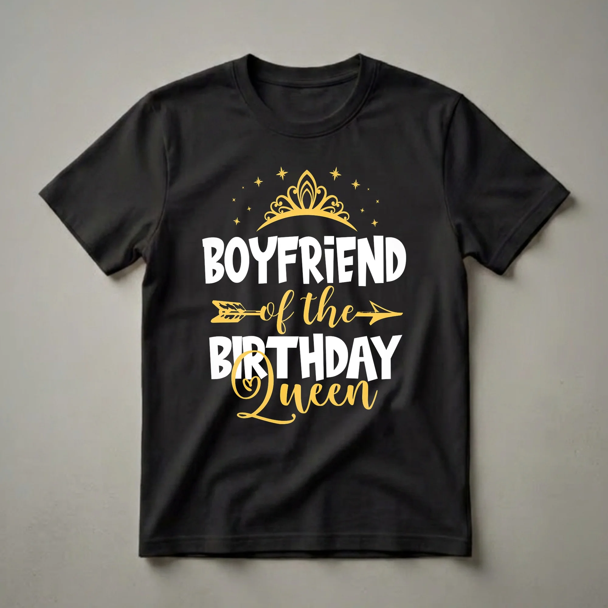 Boyfriends who want to show their support for their significant other will reach for this eye-catching tee. The graphic features bold white lettering that reads "BOYFRIEND" above "of the" in a stylish script font, followed by "BIRTHDAY QUEEN" in large white letters. A golden crown adorns the top, with scattered stars adding a festive touch. An arrow graphic pierces through the center, symbolizing direction and focus. This shirt is a fantastic way for a boyfriend to acknowledge his girlfriend's special day and her status as the star of the celebration. It's a thoughtful gift for any girlfriend celebrating a milestone birthday or simply enjoying her moment in the spotlight. This t-shirt works well for birthday parties, family gatherings, or casual outings leading up to or following the big day. It's a fun piece of apparel that celebrates the bond between a couple while honoring the birthday girl. Imagine her delight when she receives this unique shirt, a clear declaration of your admiration and support for the birthday queen in your life. It's more than just clothing; it's a statement of affection and celebration.