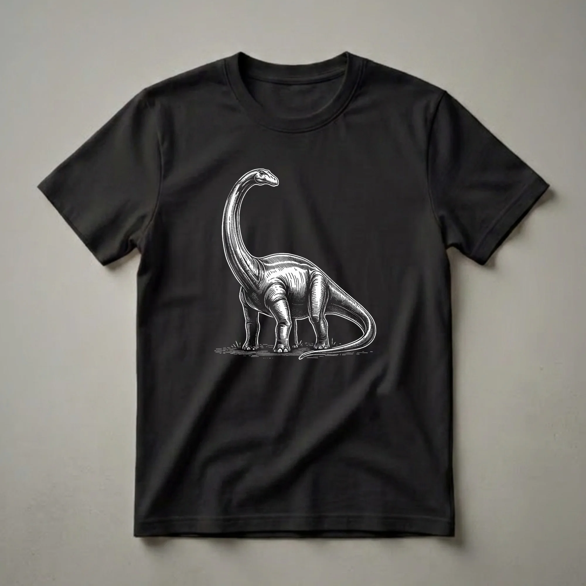 Paleontology enthusiasts will appreciate this striking graphic tee featuring a Brachiosaurus. This extinct genus of sauropod dinosaur lived during the Late Jurassic period, approximately 155 to 150 million years ago. Brachiosaurus, meaning 'arm lizard,' is known for its exceptionally long neck and forelimbs that were longer than its hindlimbs, giving it a giraffe-like posture. This detailed illustration captures the majestic presence of this herbivorous giant, rendered in a classic white line art style against a dark background. This t-shirt is a fantastic way for anyone fascinated by ancient life to express their passion. It makes a thoughtful gift for dinosaur lovers, students of natural history, or anyone who enjoys unique wildlife apparel. Wear this shirt to a museum visit, a nature walk, or simply as a conversation starter during casual outings.