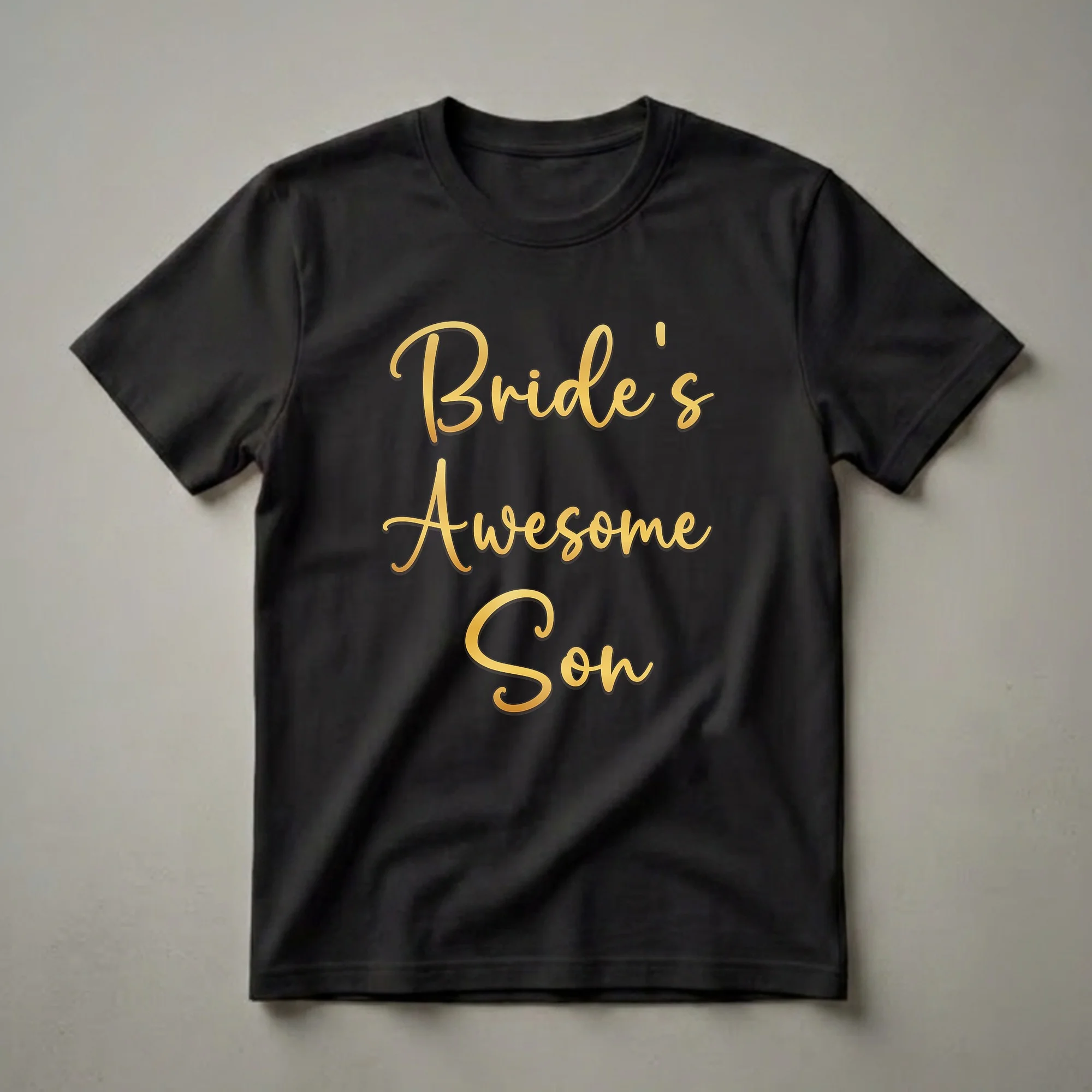 - Bride's Son wedding party tee featuring elegant gold script on black.