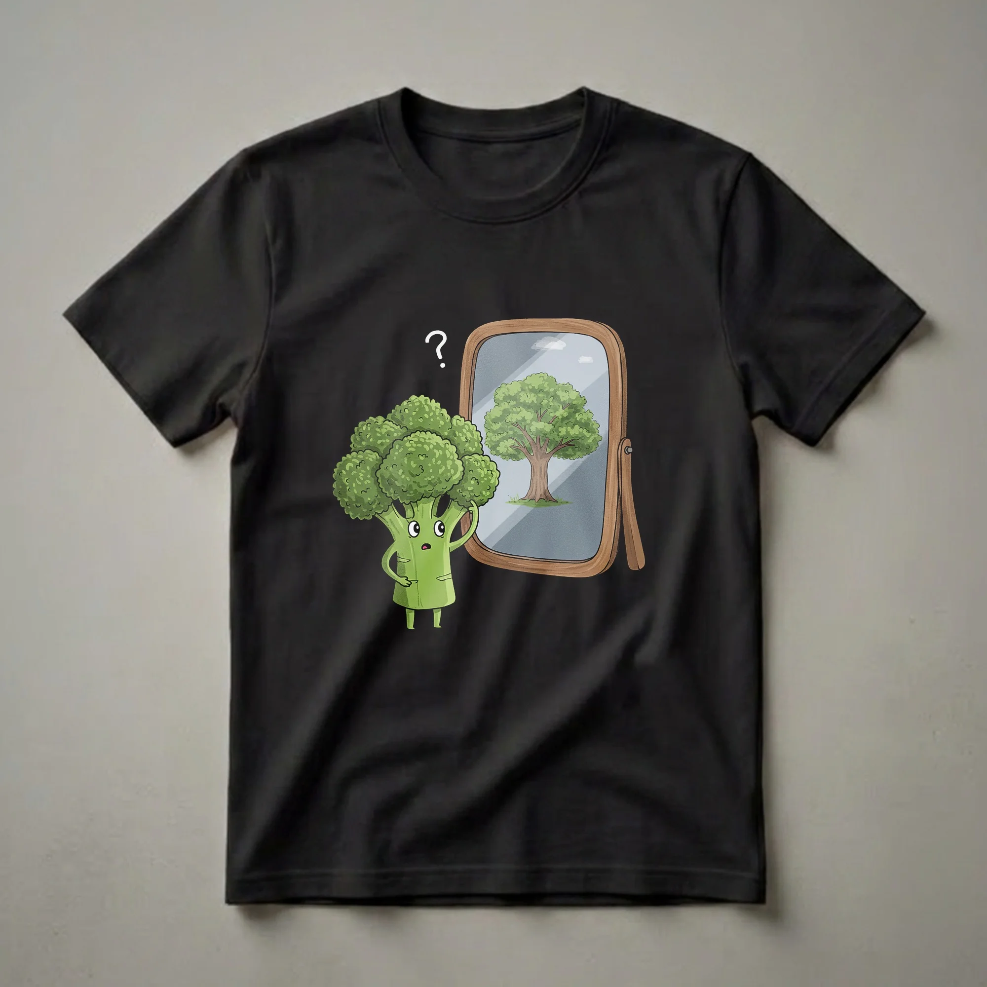 Broccoli lovers who appreciate a good chuckle will reach for this unique graphic tee. The design strikingly captures a cartoon broccoli, complete with its signature florets, arms, and legs, gazing quizzically at its reflection in a wooden-framed mirror. To its surprise, the mirror doesn't show more broccoli, but a large, mature tree, complete with a sturdy trunk and lush green canopy. This clever visual plays on the fact that broccoli florets resemble tiny trees, offering a humorous and unexpected twist for anyone who enjoys food-related puns and vegetable humor. It's a staple in any collection for those who love to wear their lighthearted appreciation for produce. This shirt works well for vegetarians, vegans, or anyone who enjoys a witty graphic design. Imagine wearing this tee to a casual brunch or a farmers market visit. It makes a thoughtful gift for friends and family who have a quirky sense of humor and a fondness for plants and healthy eating.