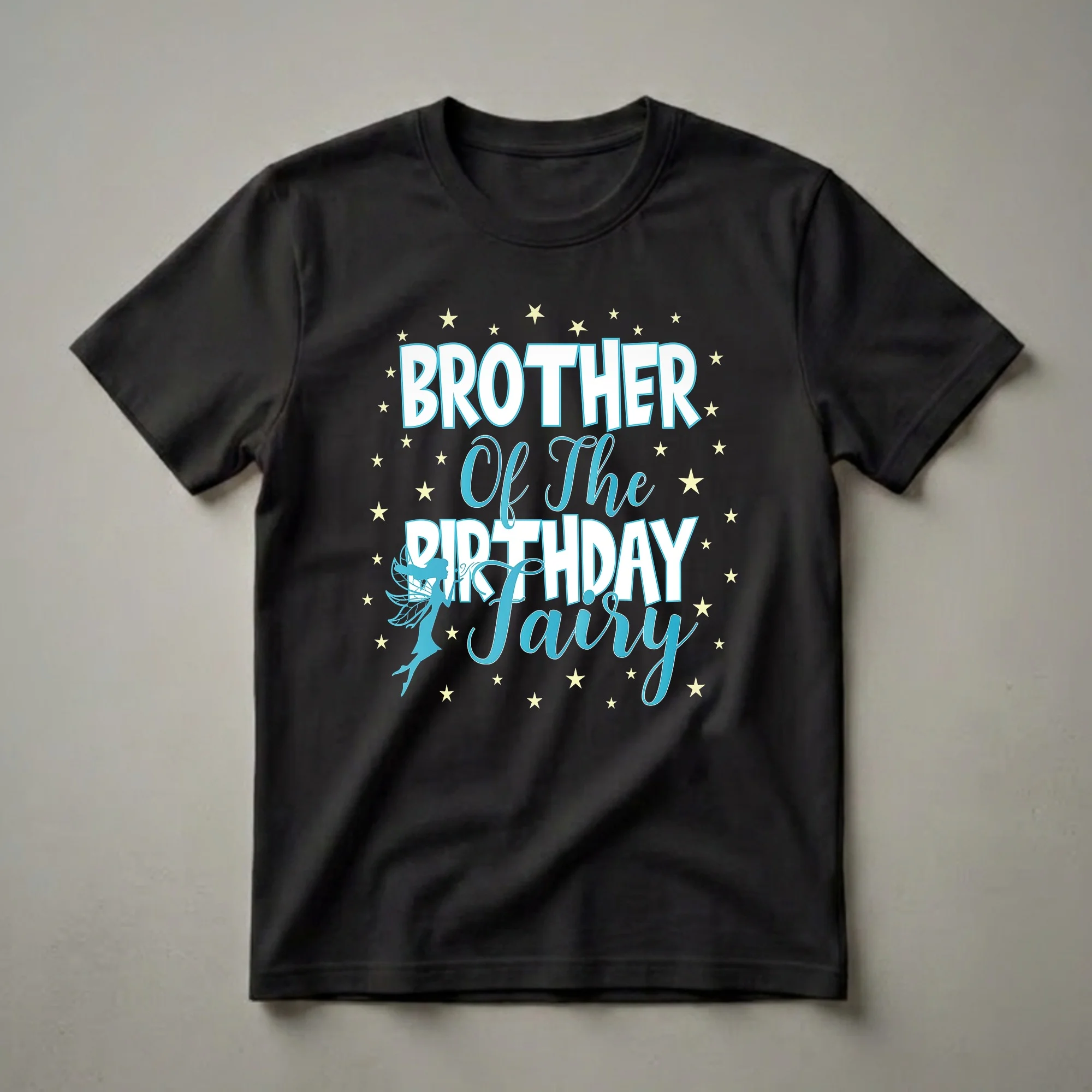 - Features bold white and blue lettering spelling "Brother Of The Birthday Fairy Princess" with scattered yellow stars.