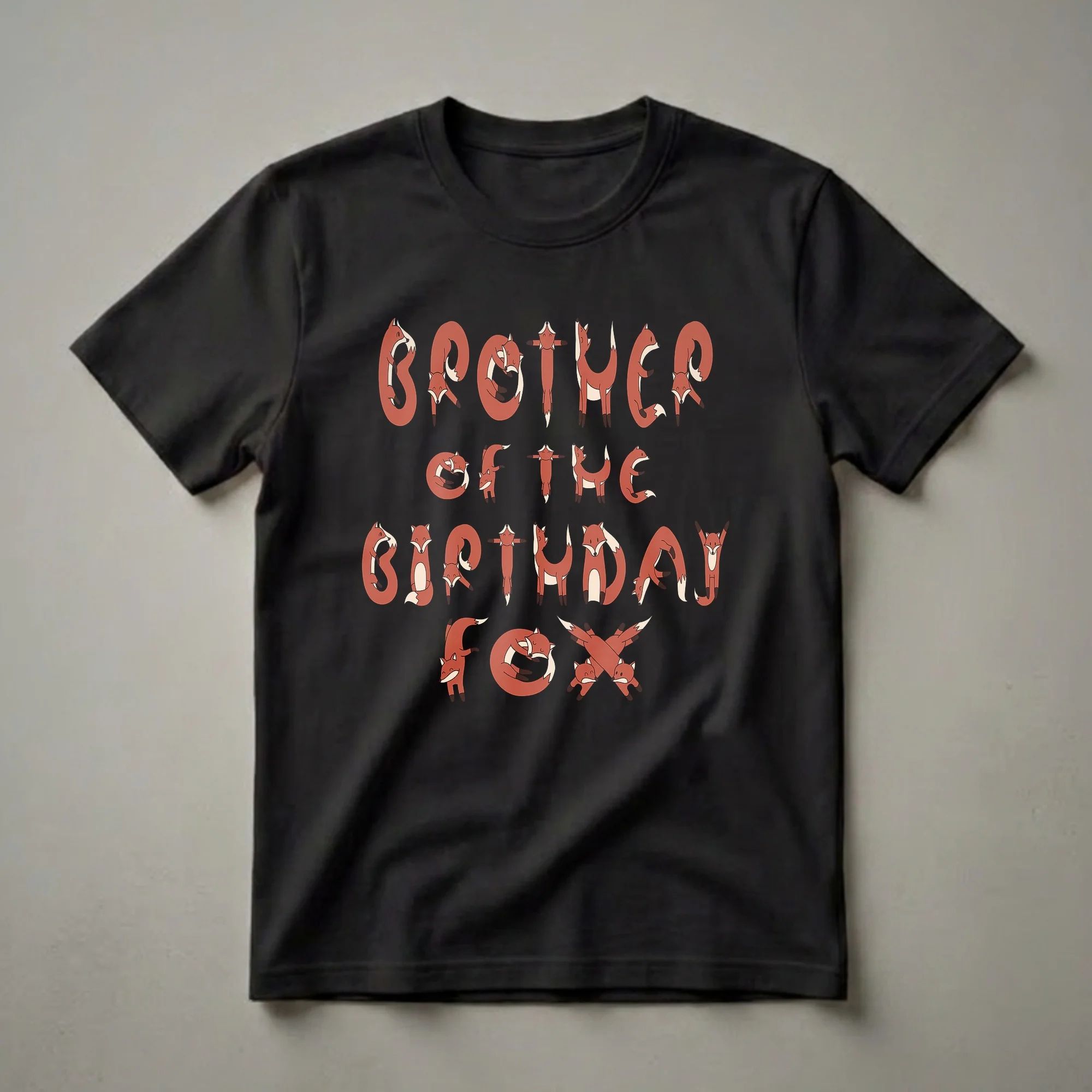 Brother of the Birthday Fox shirt for boys and girls who are celebrating a special birthday. This eye-catching graphic tee features the words "BROTHER OF THE BIRTHDAY FOX" spelled out using playful illustrations of red foxes. Each fox is depicted in various whimsical poses, some curled up, others standing or stretching, all forming the letters of the phrase. The foxes have characteristic reddish-brown fur, white accents on their chests and tails, and dark tips on their ears and paws, with simple, smiling faces. This shirt is a thoughtful gift for any young boy or girl who is the sibling of the birthday honoree, especially if they have a fondness for foxes or enjoy woodland creatures. It's a unique way to highlight their role in the celebration. Foxes, known for their cunning and adaptability, are fascinating animals often found in diverse habitats across the Northern Hemisphere, from forests to grasslands. This tee works well for birthday parties, family gatherings, or casual wear, making the wearer feel like a special part of the birthday festivities. It's a fun and memorable piece of apparel for any young sibling.