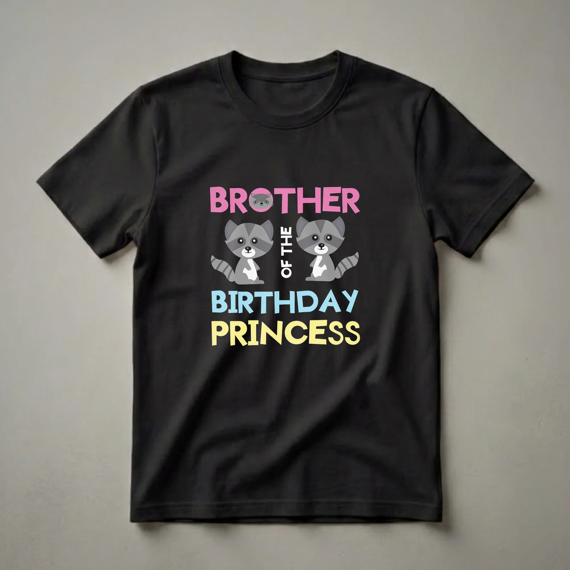 Siblings of the birthday princess can join the celebration with this fun graphic tee. The design features two cute, cartoon raccoons with striped tails, flanking the phrase "OF THE" in white text. Above them, the word "BROTHER" is displayed in bold pink lettering, with a smaller raccoon face peeking out from the 'O'. Below, "BIRTHDAY PRINCESS" is written in cheerful blue and yellow block letters. Raccoons, known for their distinctive masked faces and ringed tails, are often found in North American forests and urban areas, foraging for food. This shirt is a thoughtful gift for the brother who wants to show his support for his sister's special day. It's a great way for him to feel included in the birthday festivities, whether at a party, a family gathering, or just for everyday wear. This t-shirt makes a fun addition to any birthday outfit, coordinating with the birthday girl's theme. This apparel is a staple for any sibling duo celebrating a special occasion.