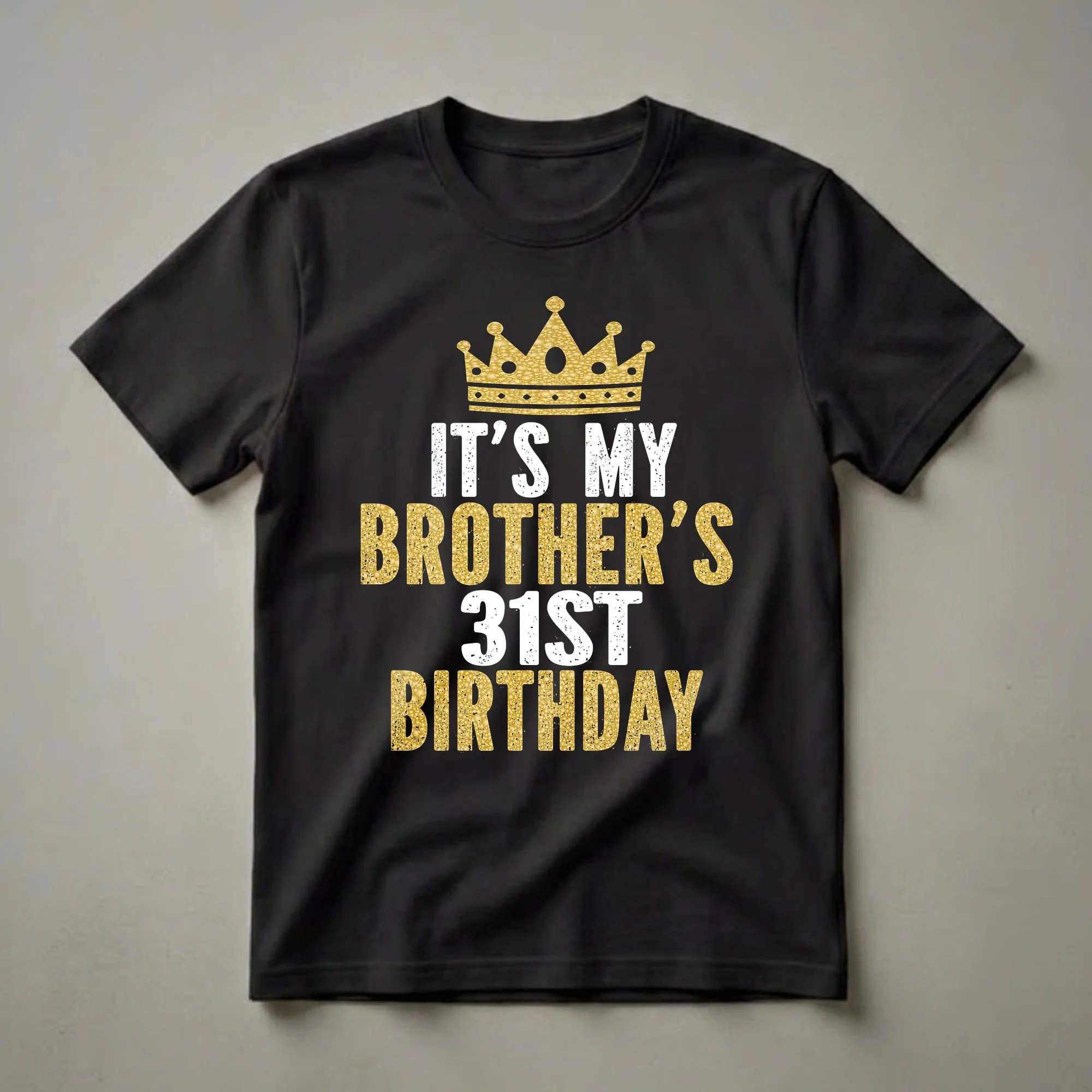 Celebrate your brother hitting the big 3-1 with this commemorative t-shirt featuring a stylish gold crown and distressed lettering. This graphic tee is designed to celebrate that special occasion for a brother. The design prominently features a regal gold crown, symbolizing royalty and achievement, set against a classic black background. Below the crown, bold white lettering declares "IT'S MY BROTHER'S". The number "31ST" is displayed in a large, eye-catching gold font, also with a distressed texture that adds a touch of vintage flair. The word "BIRTHDAY" completes the message in a similar distressed gold. This t-shirt is a thoughtful gift for any sibling celebrating their 31st year. It's a fun way for the birthday boy to show off his milestone age at a birthday dinner, party, or casual get-together. The family matching aspect means siblings can coordinate their celebrations, making the event even more memorable. This shirt is a staple for anyone looking to commemorate this important birthday with a touch of style and personality. It’s a go-to tee for the brother who appreciates a bold statement on his special day.