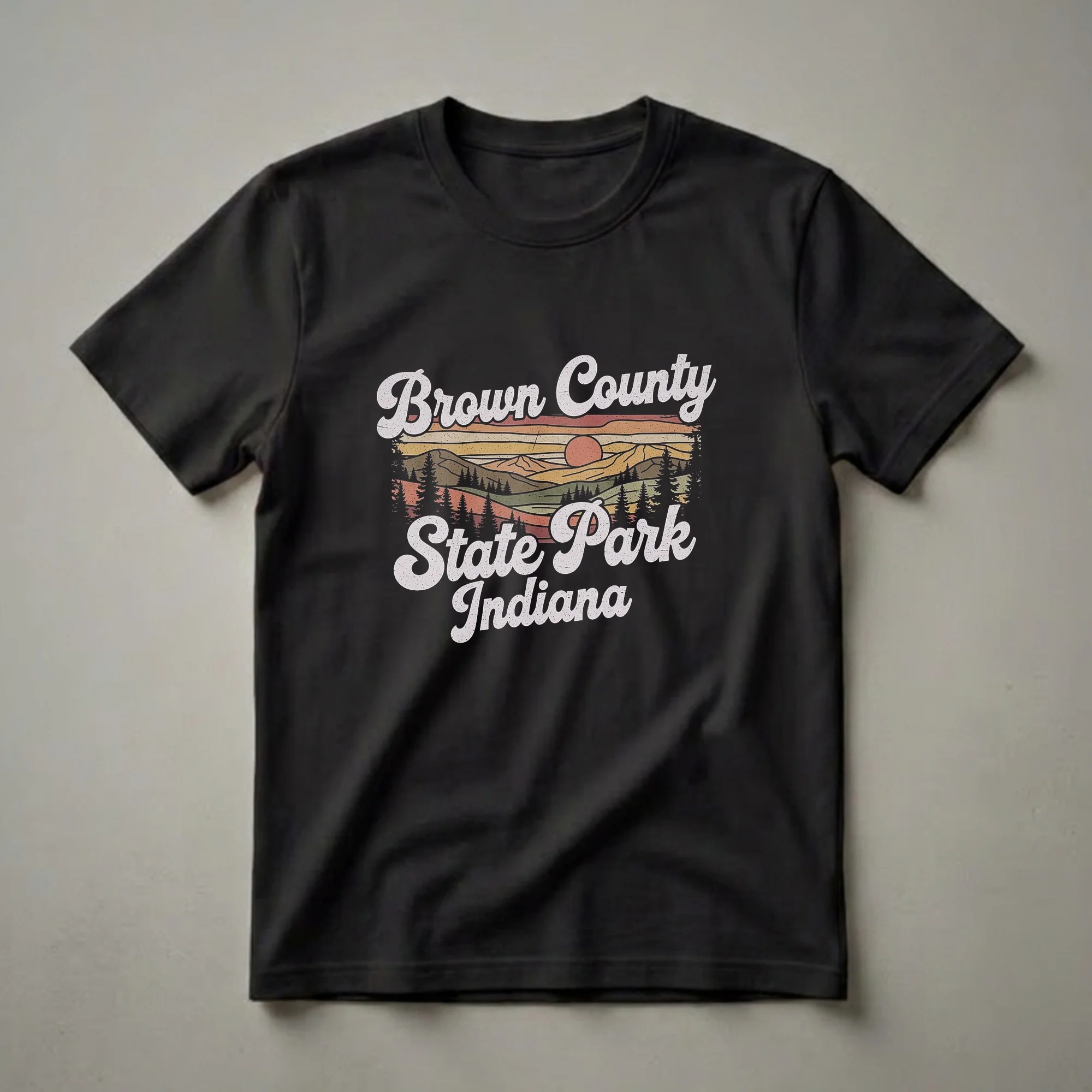 - Retro graphic tee celebrating Brown County State Park, Indiana's rolling hills and vibrant sunsets.