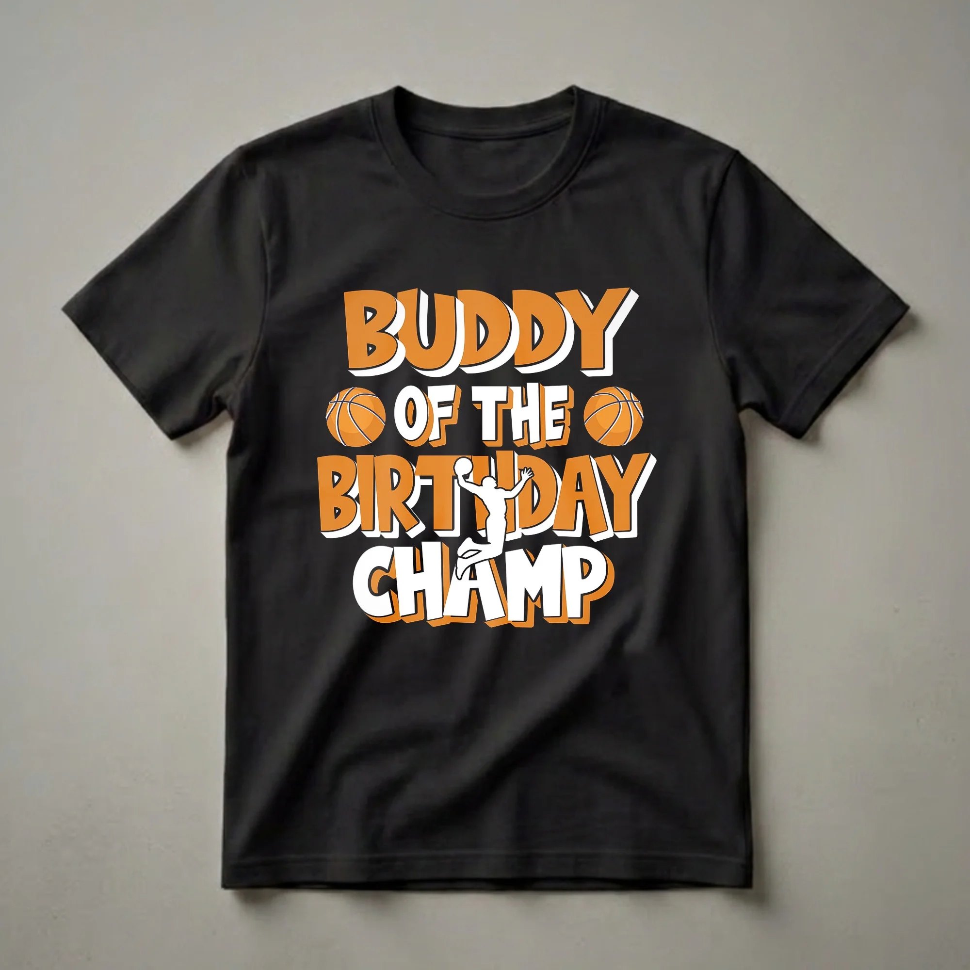 Boys who are part of the birthday celebration will love this "Buddy of the Birthday Champ" basketball t-shirt. The design features bold orange and white lettering with a dynamic silhouette of a basketball player mid-dunk, surrounded by two basketballs. This graphic tee is a fantastic way for a friend or sibling to show their support for the birthday boy. Basketball is a sport that requires teamwork and camaraderie, making this shirt a fitting tribute to the bond between friends celebrating a special occasion. Whether it's for a birthday party, a casual get-together, or just everyday wear, this shirt captures the excitement of the game and the joy of celebrating a milestone. It makes a thoughtful gift for any young basketball enthusiast who wants to be part of the birthday champ's big day. This shirt is a go-to tee for any young fan looking to add some sporty flair to their birthday outfit. Imagine the birthday champ and their buddies all wearing matching or complementary shirts, creating a memorable scene for photos.