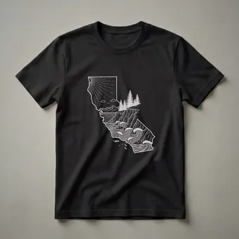 California residents and admirers of the Golden State will reach for this unique graphic tee. The design artfully fills the iconic outline of California with a breathtaking coastal scene. A radiant sunburst shines over distant mountains and a serene lake, while rugged cliffs overlook the Pacific Ocean. Crashing waves add a dynamic element to the coastline, evoking the wild beauty of the California shore. This t-shirt captures the diverse natural landscapes that make California a beloved destination, from its sunny skies to its powerful ocean. It's a staple in the collection for anyone who cherishes the state's natural wonders. This shirt makes a thoughtful gift for travelers, expats, or anyone who holds a special connection to California's unique geography and vibrant spirit. Wear it to celebrate your state pride or as a reminder of your favorite California adventures.
