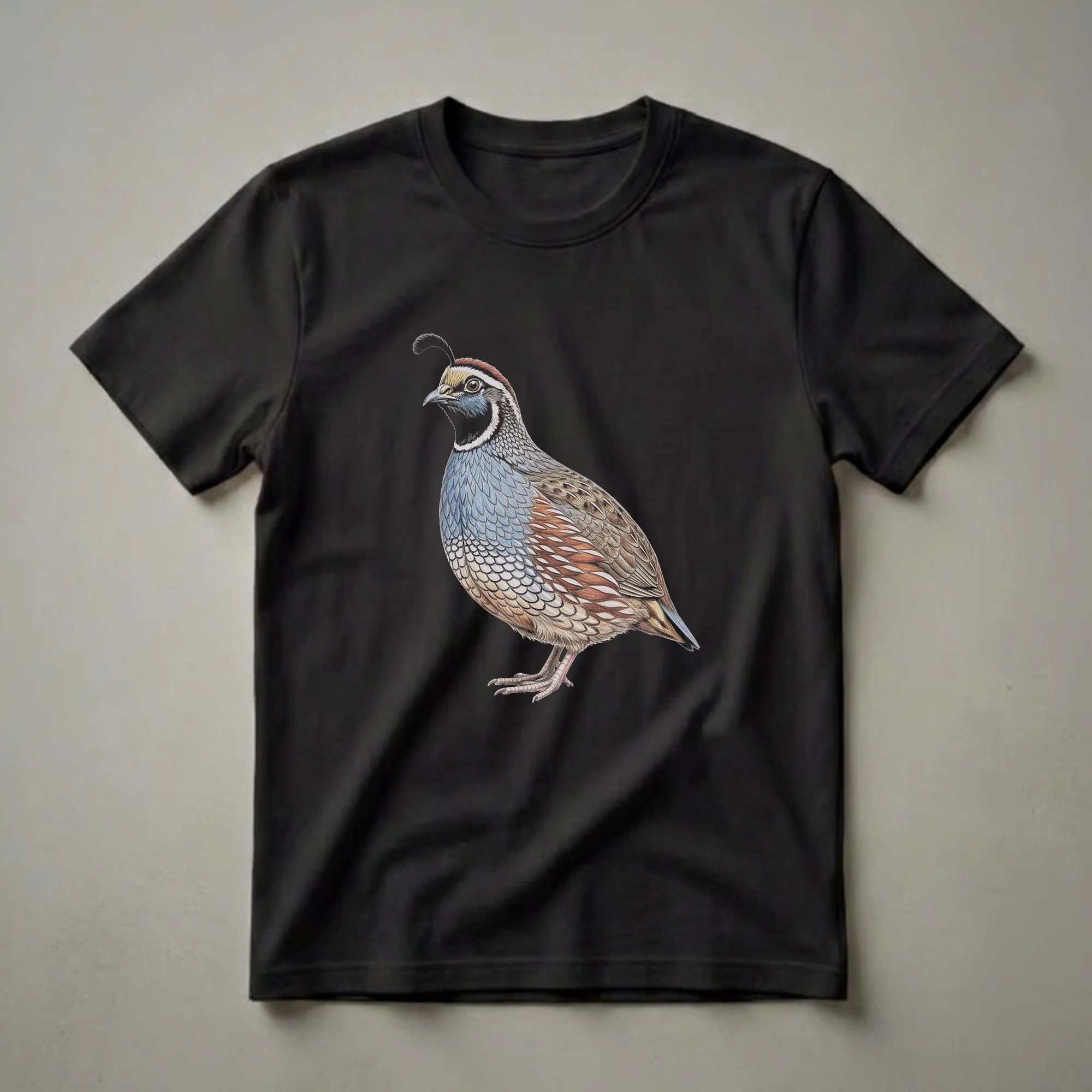 California Quail enthusiasts will appreciate the intricate detail in this vintage-style bird drawing t-shirt. The artwork features a male California Quail, easily identifiable by its distinctive comma-shaped head plume, black throat patch, and striking blue-gray and chestnut plumage. This particular species, Callipepla californica, is the official state bird of California and is known for its social nature, often found in coveys in chaparral and woodland habitats. The drawing captures the bird's textured feathers with remarkable precision, from the delicate scaling on its breast to the warm, reddish-brown tones on its flanks. This graphic tee is a staple for anyone who enjoys wildlife art or has a passion for ornithology. It makes a thoughtful gift for birdwatchers, hikers, or anyone who cherishes the natural beauty of the American West. Wear this unique shirt on your next outdoor adventure or casual outing to spark conversations about your appreciation for these charming ground birds. This apparel is a fantastic way to express your connection to the natural world.