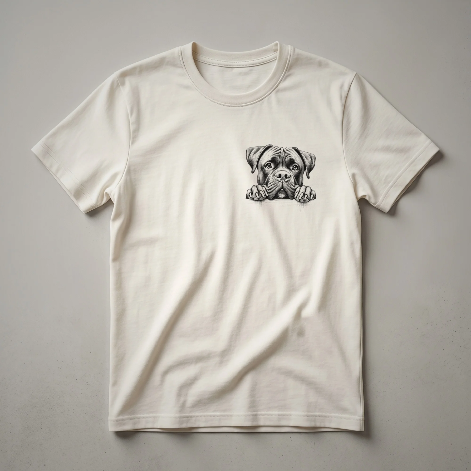 Showcase your love for the formidable Cane Corso with this eye-catching peeking dog graphic. This graphic tee captures that spirit with a striking visual of a Cane Corso's head peeking over the hem. The design is rendered in a clean, bold line art style, making the dog's features stand out against the shirt. The Cane Corso, originating from Italy, is known for its role as a guard dog and companion, often referred to as the "bodyguard dog." This shirt is a fantastic way for any Cane Corso mom or dad to express their affection for their powerful yet gentle canine friend. It makes a thoughtful gift for birthdays, holidays, or just because for the dog lover in your life who cherishes this magnificent breed. Wear this t-shirt to your next dog park visit, a casual outing, or simply while relaxing at home with your beloved pet. It's a staple in the collection for anyone who appreciates the unique character of the Cane Corso.