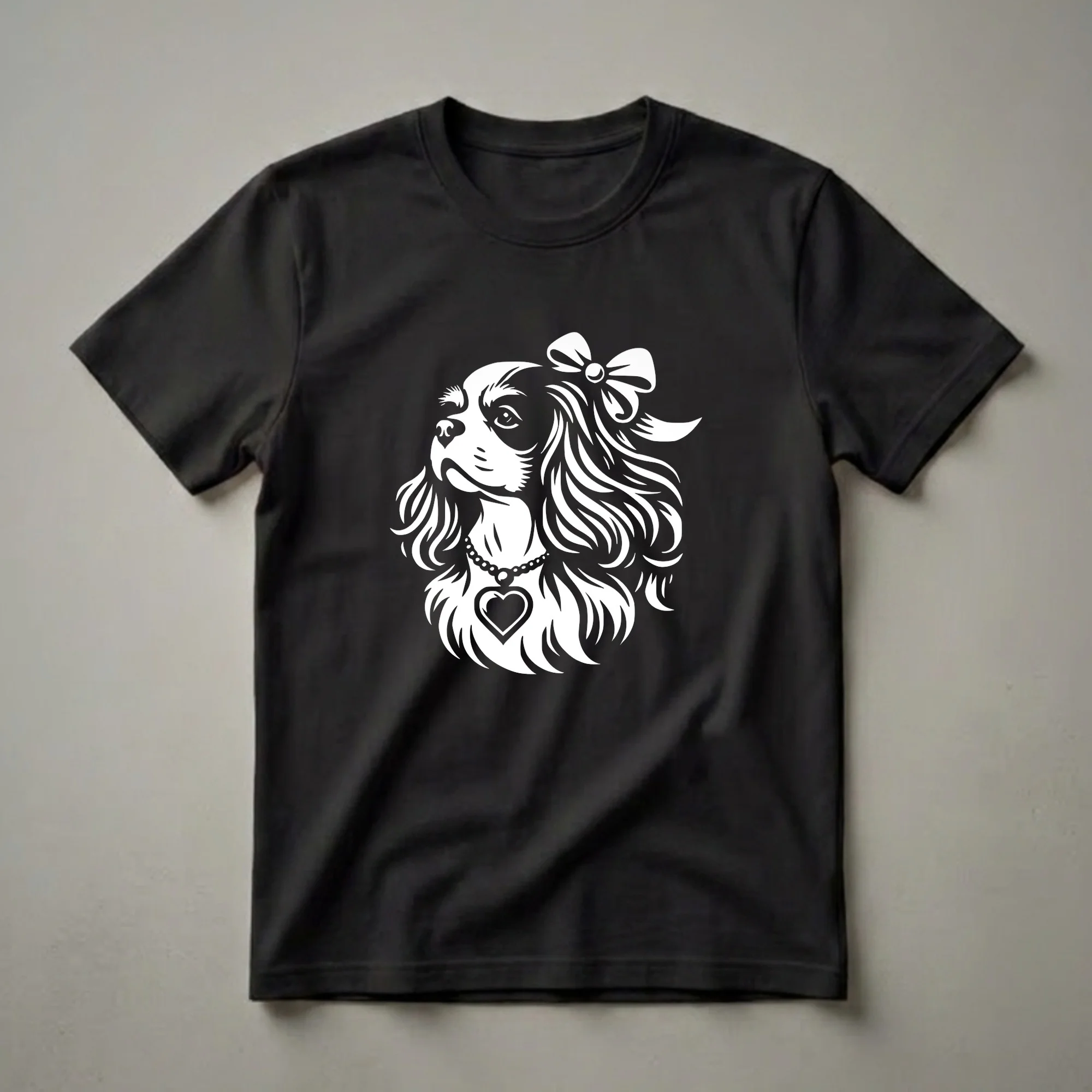 Cavalier King Charles Spaniel moms know the unique joy of sharing their lives with these affectionate and elegant companions. This striking graphic tee features a stylized portrait of a Cavalier, complete with a sweet bow atop its head and a prominent heart pendant necklace. The design captures the breed's gentle expression and flowing coat, rendered in a bold white stencil against a dark background, making it a standout piece for any dog lover's wardrobe. Cavaliers are known for their gentle nature and desire to be close to their owners, often described as 'velcro dogs' due to their strong bond with their families. This shirt is a wonderful way for a Cavalier King Charles Spaniel mother to express her devotion. It makes a thoughtful gift for birthdays, holidays, or just because for the woman who considers her dog a cherished member of the family. Wear this comfortable tee to your next dog park visit, a casual brunch with friends, or simply while relaxing at home with your beloved canine companion.