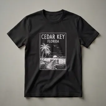 Cedar Key, Florida, a charming coastal community, is beautifully depicted in this vintage-inspired graphic tee. The artwork showcases a serene sunset over the water, with a wooden pier extending into the calm sea. Two palm trees stand tall on the left, their fronds reaching towards the sky, while seagulls gracefully fly overhead. The sun, depicted with radiating lines, dips below the horizon, casting a warm glow over the scene. This t-shirt is a wonderful way for anyone who loves Florida's natural beauty to express their connection to the Sunshine State. Cedar Key is known for its laid-back atmosphere and abundant wildlife, making it a popular destination for fishing and birdwatching. This shirt makes a thoughtful gift for anyone who has visited Cedar Key or dreams of experiencing its tranquil coastal charm. Wear this tee to remember your Florida vacation or to showcase your state pride. It's a staple in any collection for those who appreciate coastal landscapes and vintage travel aesthetics. This graphic shirt is a reminder of the peaceful moments found by the water's edge.