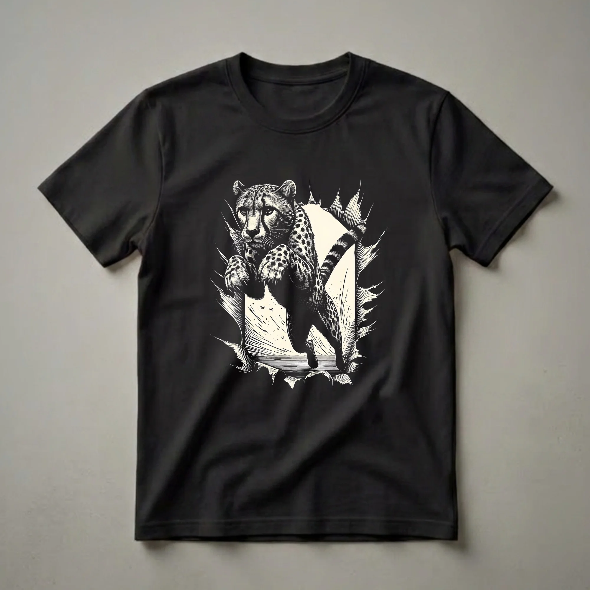 Wildlife enthusiasts and nature lovers will appreciate this eye-catching graphic tee featuring a dynamic cheetah in mid-leap. The art style, reminiscent of woodcut or linocut prints, captures the raw power and agility of the cheetah as it bursts through a torn frame. Cheetahs, known as the fastest land animals, are native to Africa and parts of Iran, often found in grasslands and savannas. This shirt is a thoughtful gift for anyone who admires these magnificent big cats. Wear this unique t-shirt to express your passion for the natural world, whether you're out on a hike or enjoying a casual day. It's a staple in the collection for those who connect with the untamed spirit of the wild. This apparel makes a thoughtful gift for the wildlife photographer or conservationist in your life.