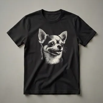 Chihuahua admirers will appreciate this striking scratchboard art piece that captures the breed's unique character. This graphic tee features a detailed scratchboard-style illustration of a Chihuahua's face, capturing its alert ears, expressive eyes, and characteristic snout. The art style uses fine lines to create texture and depth, giving the dog a striking, almost vintage look against the solid black background. Chihuahuas, originating from Mexico, are known for being the smallest dog breed and are often described as having a bold and confident demeanor, despite their size. This t-shirt is a thoughtful gift for any woman or man who cherishes their Chihuahua, whether they are a devoted dog mom, a proud dog dad, or simply an admirer of this unique breed. It's a conversation starter and a way to wear your affection for your furry friend. This shirt works well for casual outings, dog park visits, or simply relaxing at home with your beloved pet. The detailed artwork makes this shirt a standout piece for any dog lover's wardrobe, offering a unique way to celebrate the charm of the Chihuahua.