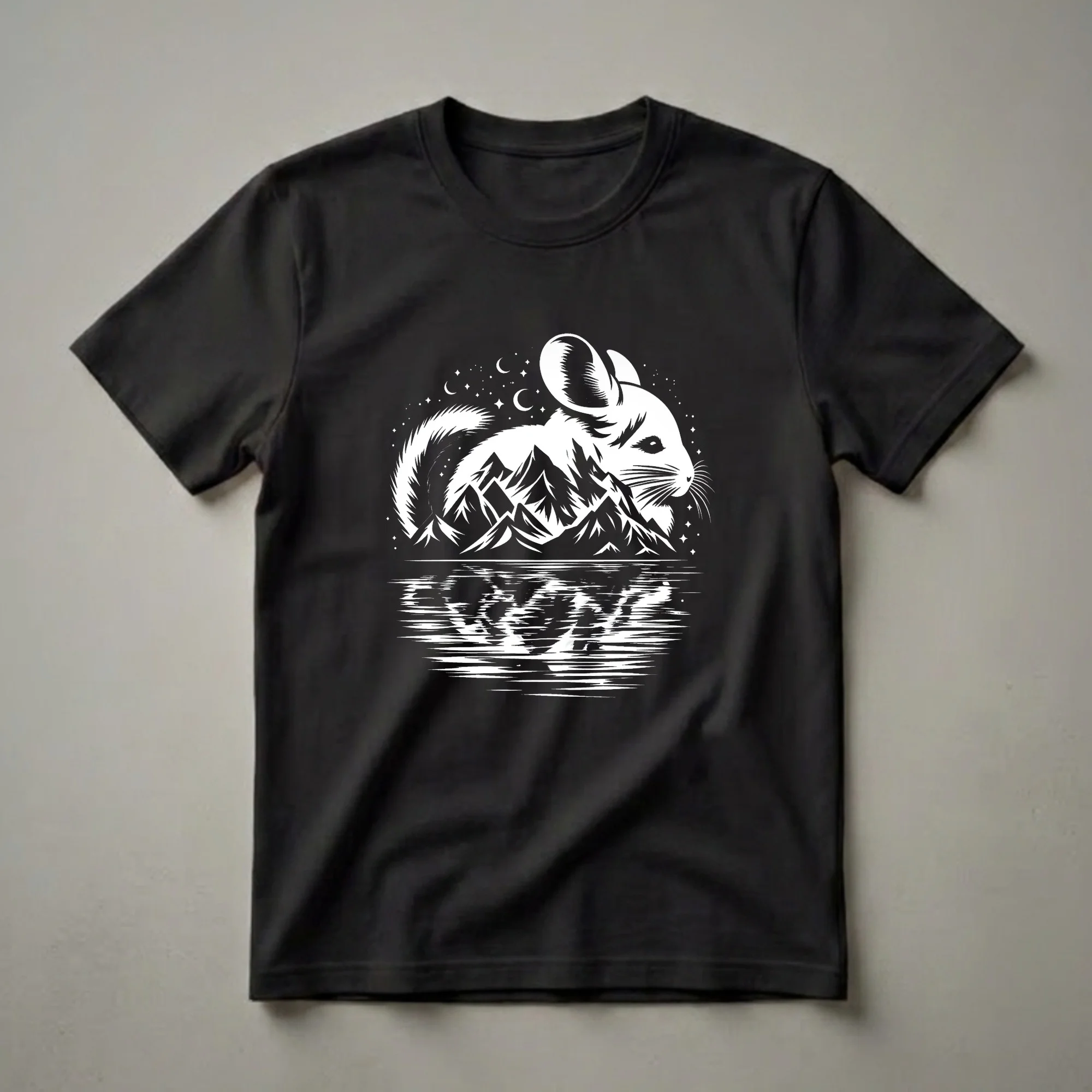 Chinchilla owners and wildlife admirers will reach for this striking graphic tee, featuring a unique artistic interpretation of their beloved rodent. The design showcases a chinchilla's head, rendered in white silhouette, emerging from a majestic mountain range. Below, the mountains are reflected in calm, rippling water, creating a serene, almost mystical scene. Above the chinchilla's head, a scattering of stars and crescent moons adds to the nocturnal ambiance. Chinchillas, native to the Andes Mountains of South America, are known for their incredibly soft fur and their crepuscular activity, meaning they are most active at dawn and dusk. This shirt captures that quiet, reflective mood often associated with these fascinating creatures. It's a perfect way for anyone who appreciates unique wildlife art to express their passion. This t-shirt makes a thoughtful gift for the chinchilla mom or dad in your life, or for anyone who finds solace in the beauty of nature and the wild. Wear it on your next hike or to a casual gathering to spark conversations about these captivating animals.