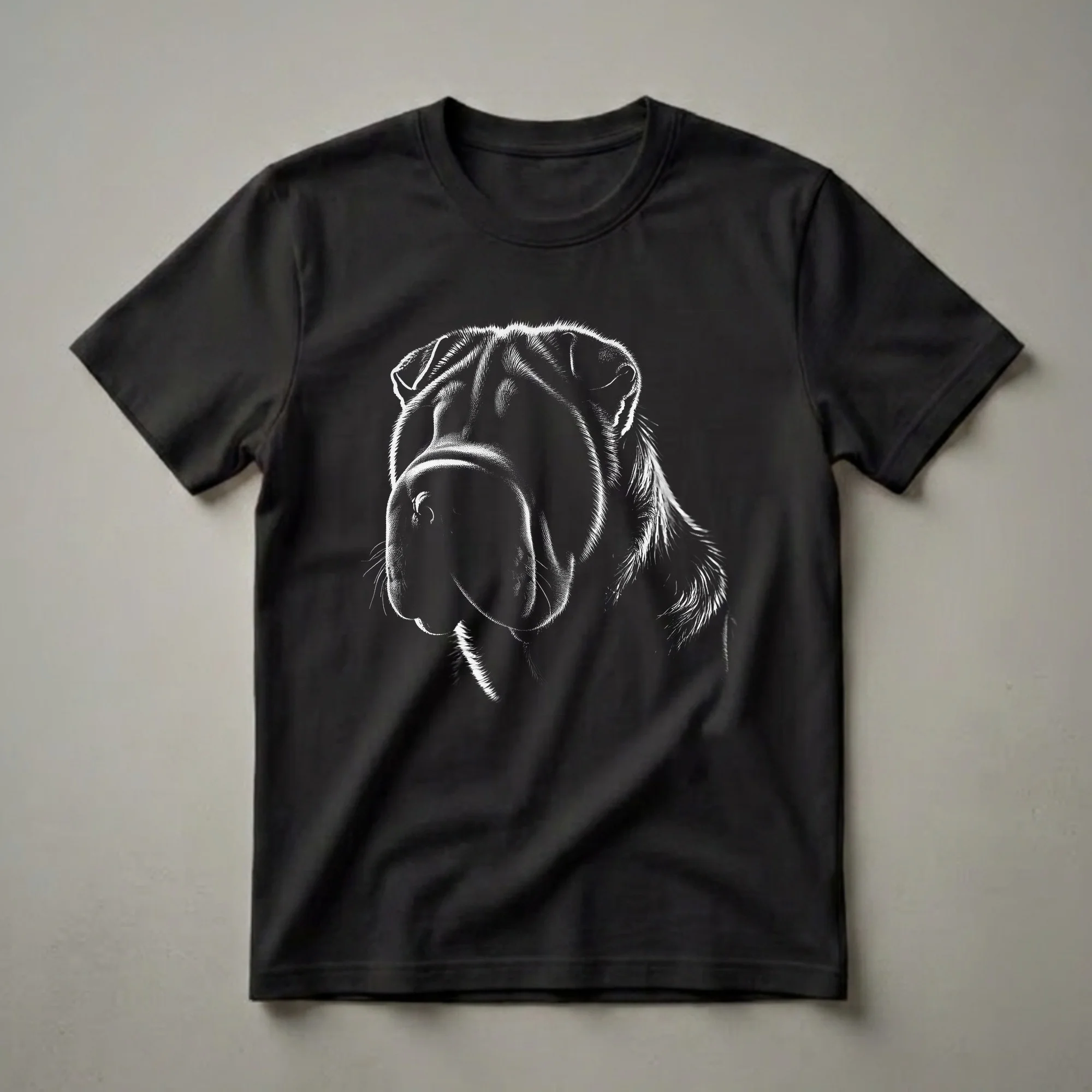 Chinese Shar-Pei owners know the distinctive charm and loyal nature of this ancient breed. This graphic tee features a striking black and white line art illustration of a Chinese Shar-Pei's face, highlighting its characteristic wrinkles and noble profile against a solid black background. The detailed linework captures the texture of its coat and the unique contours of its head, making it an eye-catching piece for any dog enthusiast. This shirt is a thoughtful gift for anyone who cherishes their wrinkled companion or admires the breed's unique appearance. It's a go-to tee for casual outings, dog park visits, or simply relaxing at home with your furry friend. Wear this shirt to express your affection for this remarkable dog breed and spark conversations with fellow dog lovers.