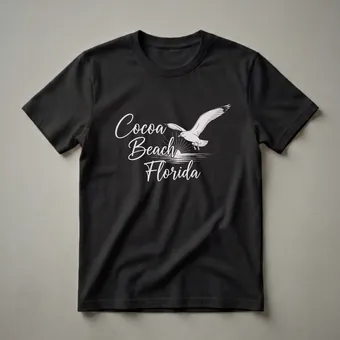 Florida travelers who cherish coastal memories will reach for this unique t-shirt. The graphic showcases a stylized sunrise with radiating lines over calm water, a scene often witnessed along the Atlantic coast. A graceful seagull in flight adds a dynamic element to the design, evoking the feeling of freedom and the ocean breeze. The words 'Cocoa Beach Florida' are presented in an elegant script font, clearly marking the destination. Cocoa Beach, located on Florida's Space Coast, is renowned for its surfing culture and proximity to the Kennedy Space Center. This tee serves as a wearable memento for anyone who has experienced the sun-drenched shores and vibrant atmosphere of this popular Florida locale. It makes a thoughtful gift for friends or family planning a trip to the Sunshine State or for those who wish to keep a piece of Florida with them. Wear this shirt to casual outings, beach days, or while reminiscing about your travels.