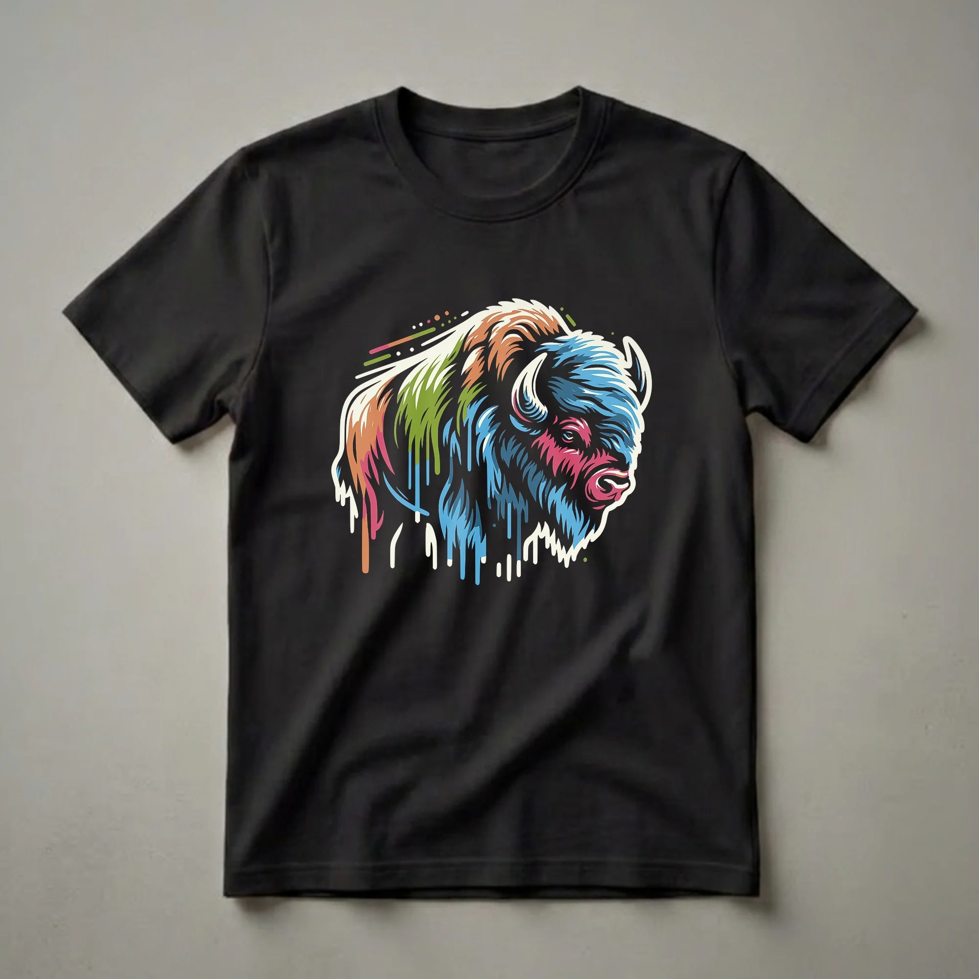 American Bison enthusiasts will appreciate this striking graphic tee featuring a bold, colorful depiction of the iconic North American mammal. The artwork showcases the bison's powerful head with a unique geometric style, accented by dripping paint effects in vibrant hues of blue, pink, orange, and green against a black background. These majestic animals, also known as buffalo, are the largest land mammals in North America and once roamed the Great Plains in vast herds. Their resilience and strength are captured in this eye-catching design, making it a standout piece for anyone who admires wildlife. This shirt works well for nature lovers, hikers, or anyone who wants to express their connection to the wild. It makes a thoughtful gift for someone who cherishes the spirit of the American West or enjoys unique animal art. Wear this t-shirt to your next outdoor adventure or casual gathering to spark conversations about these incredible creatures. The bold colors and abstract style ensure this bison shirt is a conversation starter.