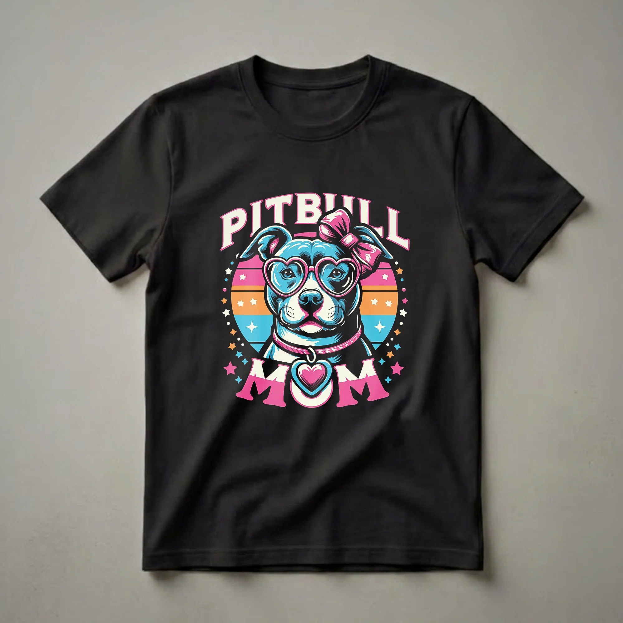 Pitbull moms know the unique bond they share with their loyal companions. This eye-catching graphic tee celebrates that special connection with a vibrant and playful design. The artwork features a stylized American Pitbull Terrier, rendered in bold blues and pinks, sporting trendy heart-shaped glasses and a festive pink bow atop its head. The words 'PITBULL MOM' are prominently displayed in large, colorful lettering, with a heart-shaped pendant hanging from the dog's collar. The background is a circular motif with colorful stripes and scattered stars, adding to the energetic and fun aesthetic. This t-shirt is a fantastic way for any Pitbull owner to express her love for her dog. It makes a thoughtful gift for birthdays, holidays, or just because for the Pitbull mom in your life who cherishes her furry family member. Wear this shirt to the dog park, on casual outings, or while relaxing at home, showcasing your devotion to your beloved Pitbull.