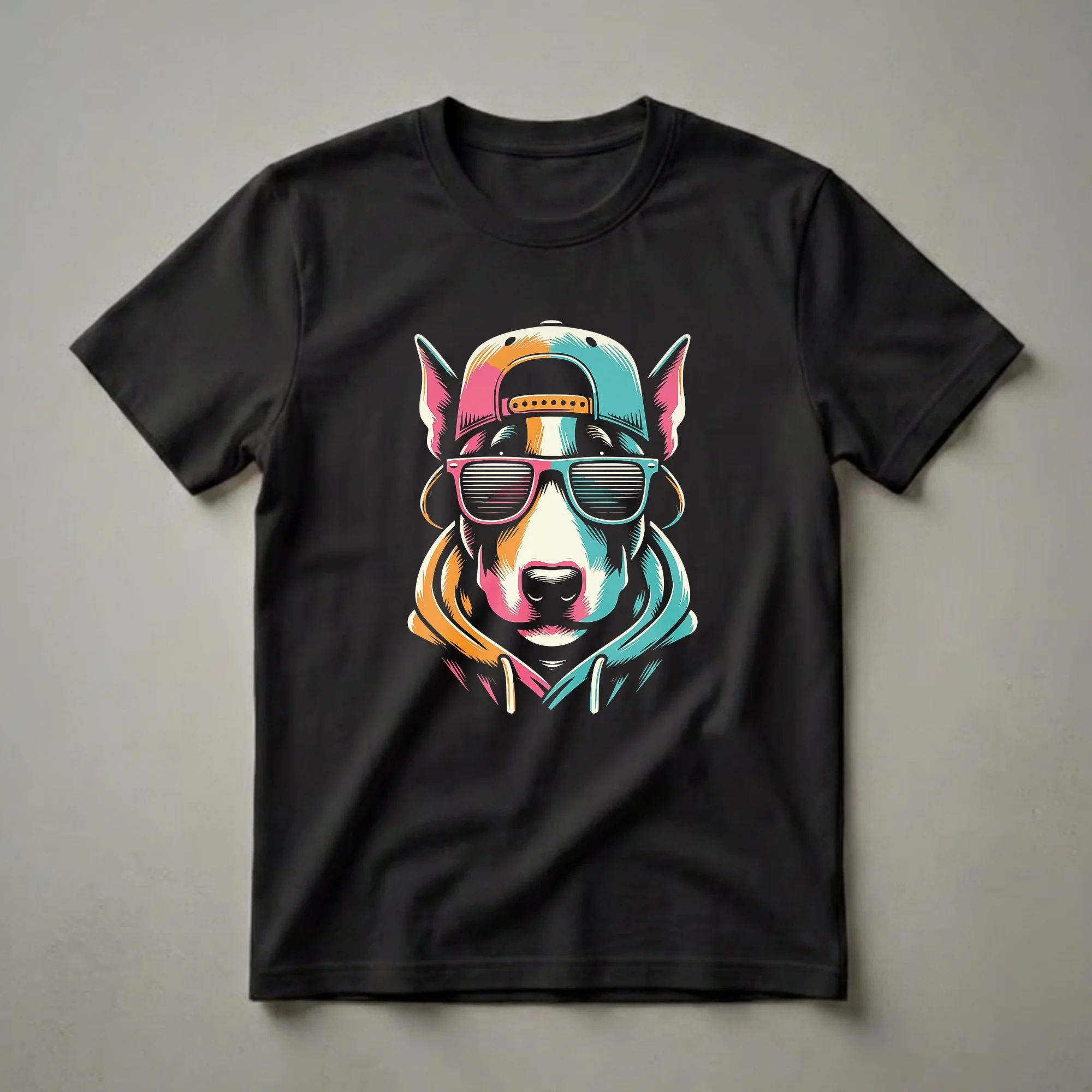 Bull Terrier owners know their dogs possess a unique, spirited personality, often described as playful and courageous. This eye-catching graphic tee captures that spirit with a vibrant illustration of a Bull Terrier sporting a backward baseball cap and stylish sunglasses. The design uses a bold, retro color palette of pink, teal, and orange against a black background, giving it a striking, pop-art feel. The dog's expression is cool and confident, making this shirt a statement piece for any dog enthusiast. This t-shirt is a fantastic way for any Bull Terrier mom or dad to express their affection for their beloved pet. It's a go-to tee for casual outings, dog park visits, or just lounging at home. Looking for a gift for the Bull Terrier lover in your life? This unique shirt makes a thoughtful gift for birthdays, holidays, or just because. Celebrate the bond you share with your canine companion with this distinctive Bull Terrier apparel.