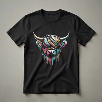 Scottish Highland cows, known for their distinctive long, shaggy hair and impressive horns, are brought to life in this eye-catching graphic tee. The design features a close-up of the cow's face, rendered in a bold, geometric style with vibrant splashes of teal, pink, and gold paint that appear to be dripping down. This artistic interpretation captures the rugged charm of these hardy cattle, which are native to the Scottish Highlands and are well-adapted to harsh climates. This t-shirt is a fantastic way for any cattle enthusiast or admirer of unique animal art to express their passion. It makes a thoughtful gift for anyone who appreciates distinctive farm animal imagery or enjoys a pop of color in their wardrobe. Wear this shirt to casual outings, farm visits, or any occasion where you want to showcase your appreciation for these iconic bovines. The striking design ensures you'll stand out, making it a go-to tee for animal lovers.
