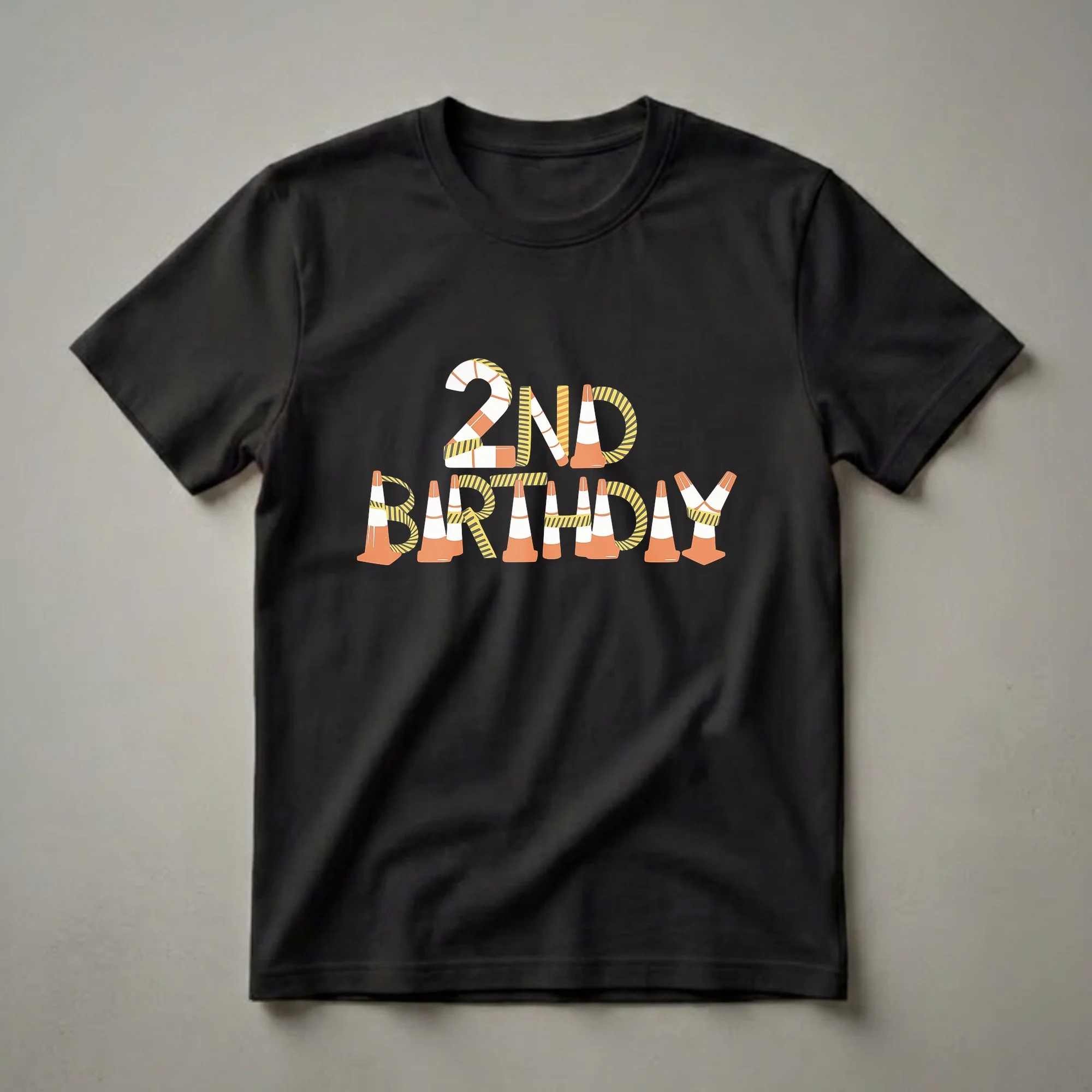 Two-year-olds are entering a phase of active exploration, often fascinated by the world around them, including construction sites. This vibrant graphic tee captures that excitement with a playful construction theme. The design prominently features the words "2ND BIRTHDAY" creatively rendered using orange and white traffic cones, accented with yellow and black caution tape. The bold lettering and construction elements make this shirt an eye-catching choice for any toddler's special day. It's a fantastic way to celebrate a child turning two, especially if they have a budding interest in trucks, diggers, and building. This t-shirt works well for a birthday party, a casual day out, or as a thoughtful gift for a two-year-old. Imagine the birthday boy or girl wearing this fun construction shirt as they play and celebrate turning two. It's a staple for any toddler's birthday wardrobe, offering a unique and memorable look for their big day. This shirt is a go-to for parents looking for a fun, age-appropriate birthday outfit that reflects a child's current interests. It makes a thoughtful gift for any two-year-old who loves all things construction.