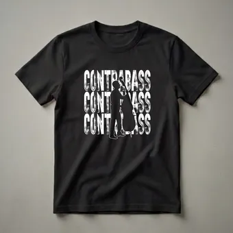 Musicians who play the contrabass, also known as the double bass, will appreciate this striking graphic tee. The design features the word 'CONTRABASS' repeated in a distressed, brushstroke style, creating a visually engaging pattern. Centered within the text is a bold black silhouette of a musician playing the instrument, complete with their hat and the distinctive shape of the double bass. This shirt is a fantastic way for bassists to express their passion for their instrument. The contrabass is the largest and lowest-pitched member of the orchestral string family, often found in orchestras, jazz ensembles, and chamber music. It provides the foundational low end in many musical genres. This t-shirt works well for music students, professional orchestral players, or jazz musicians. It makes a thoughtful gift for the contrabass player in your life, great to wear to rehearsals, concerts, or casual music gatherings. Celebrate your love for the low notes and the iconic double bass with this eye-catching apparel.